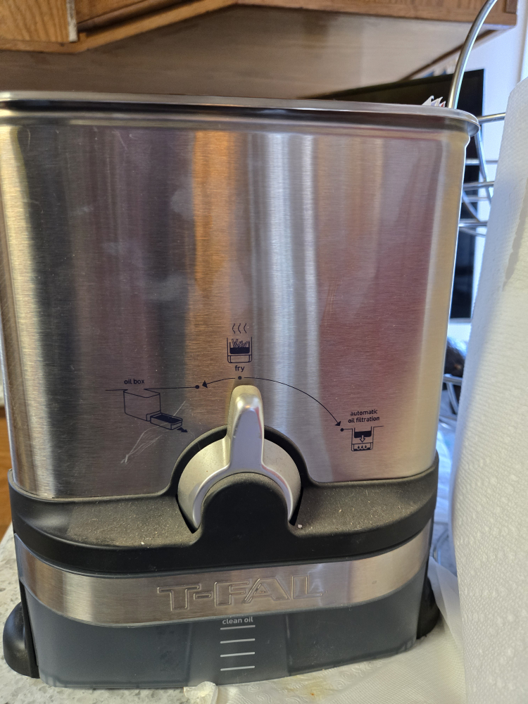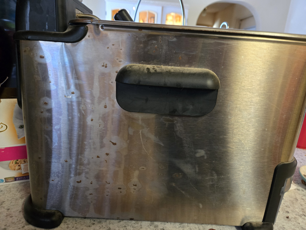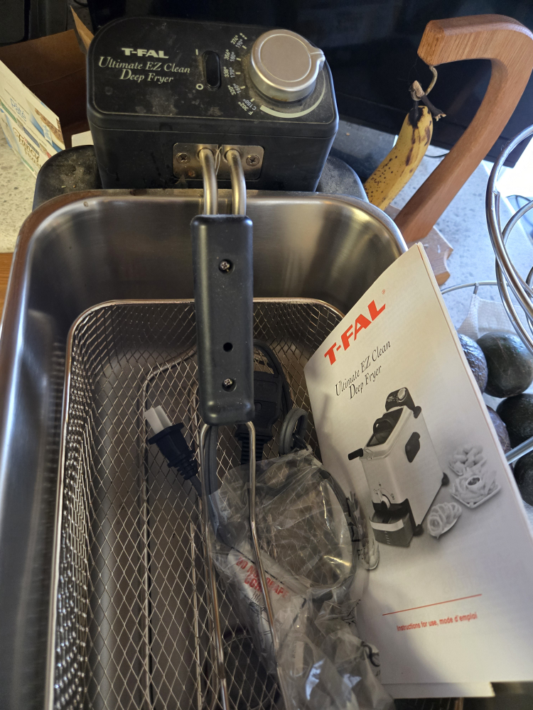 Stainless steel deep fryer. Includes instruction manual and fry basket. Shows some signs of use.