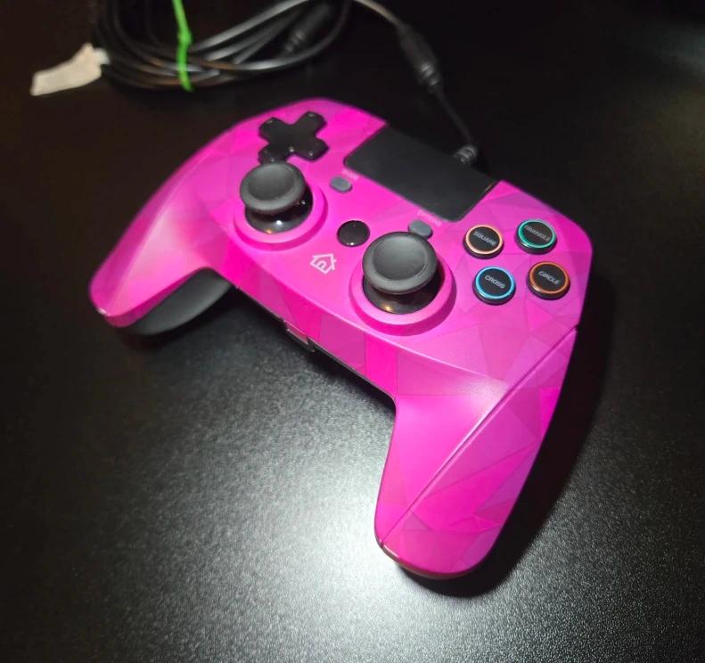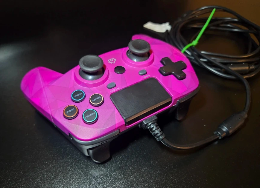 Snakebyte Gamepad 4 S – Wired – Great Condition. Fully tested on PS4, all inputs working perfectly. Joysticks are in excellent shape, buttons are clean with no stickiness. One minor imperfection: small edge flaw on the right handle. May be compatible with PC with the right programs installed. No special buttons, simple and reliable.