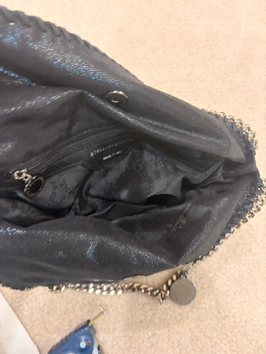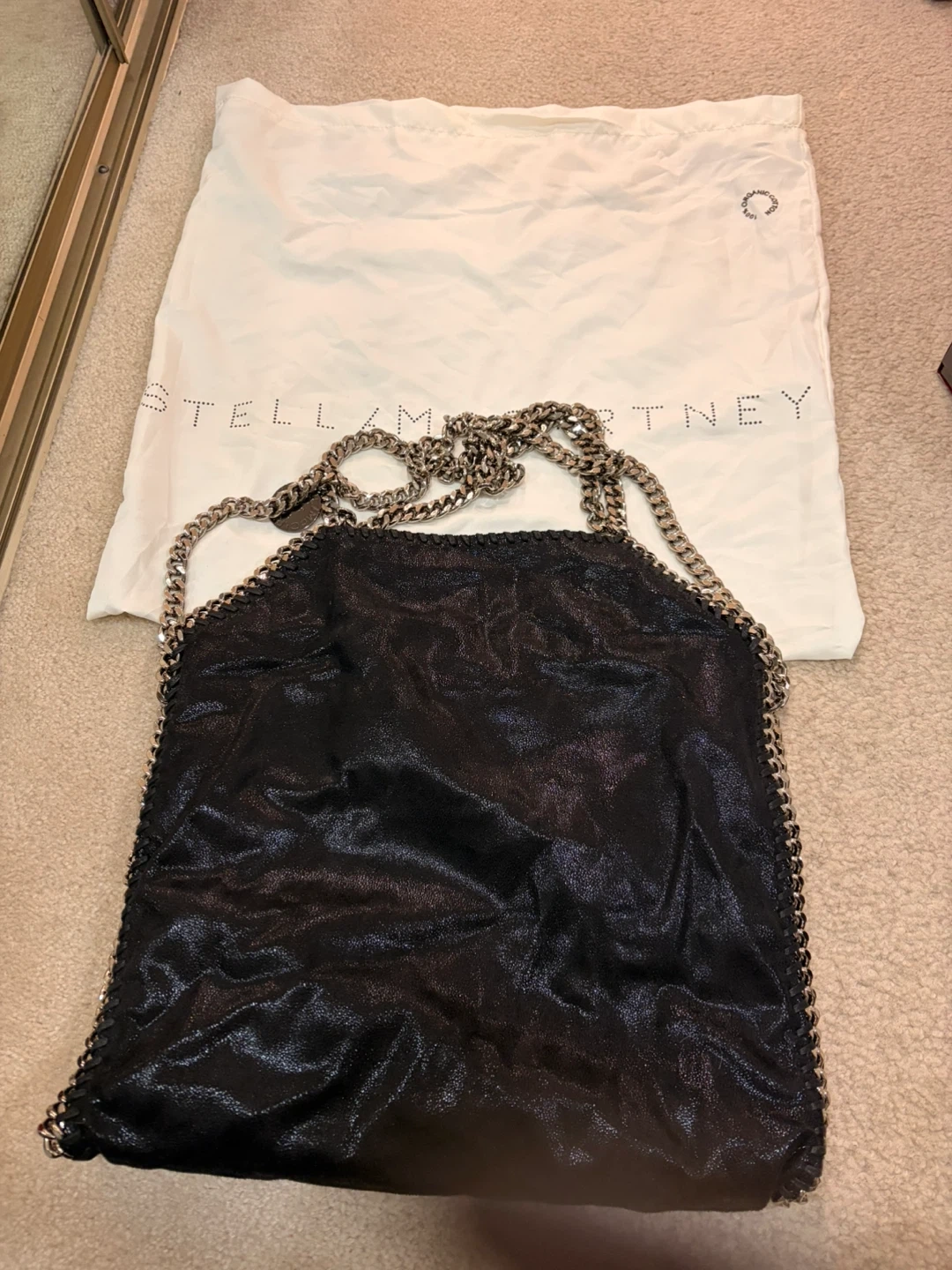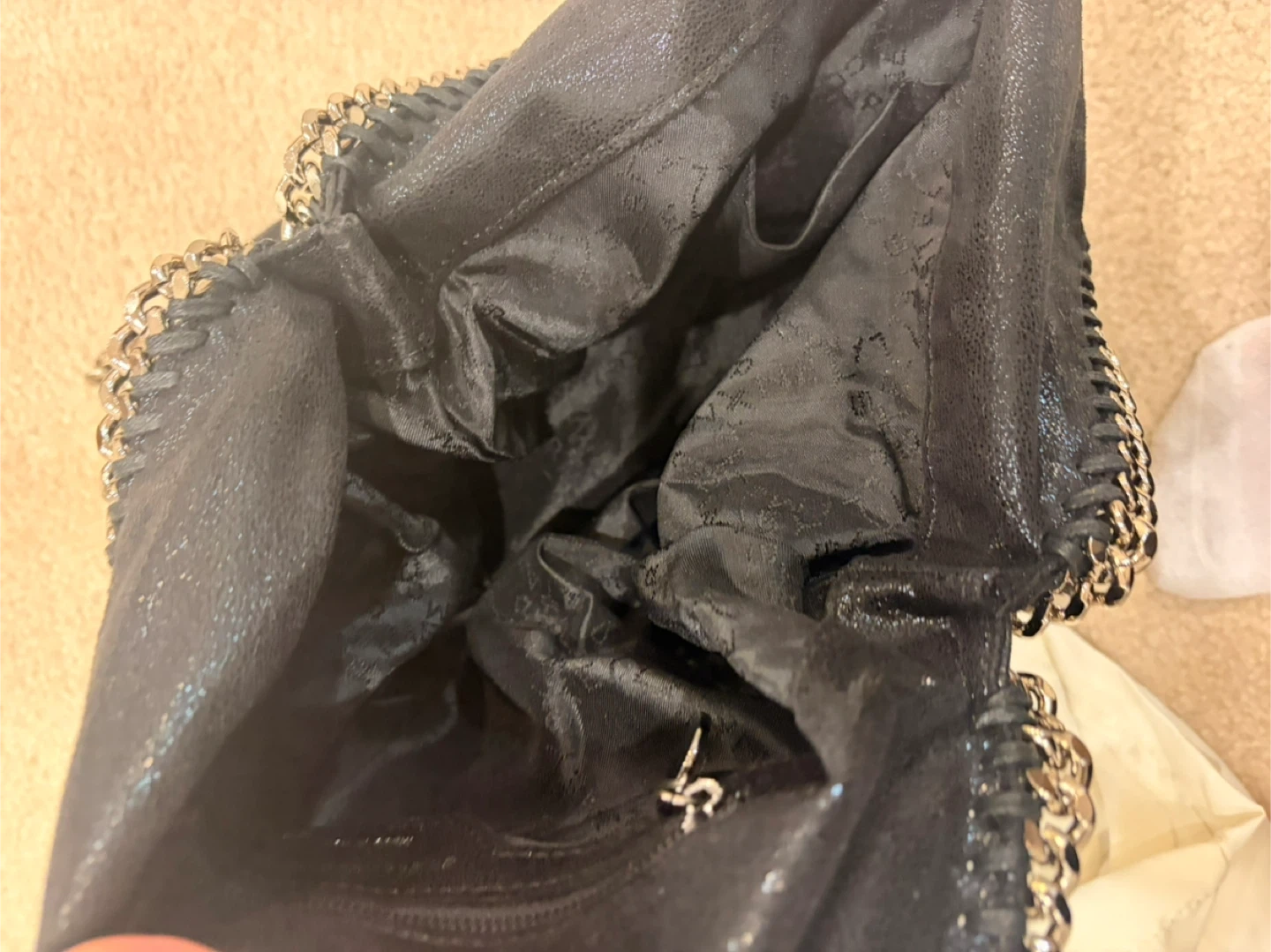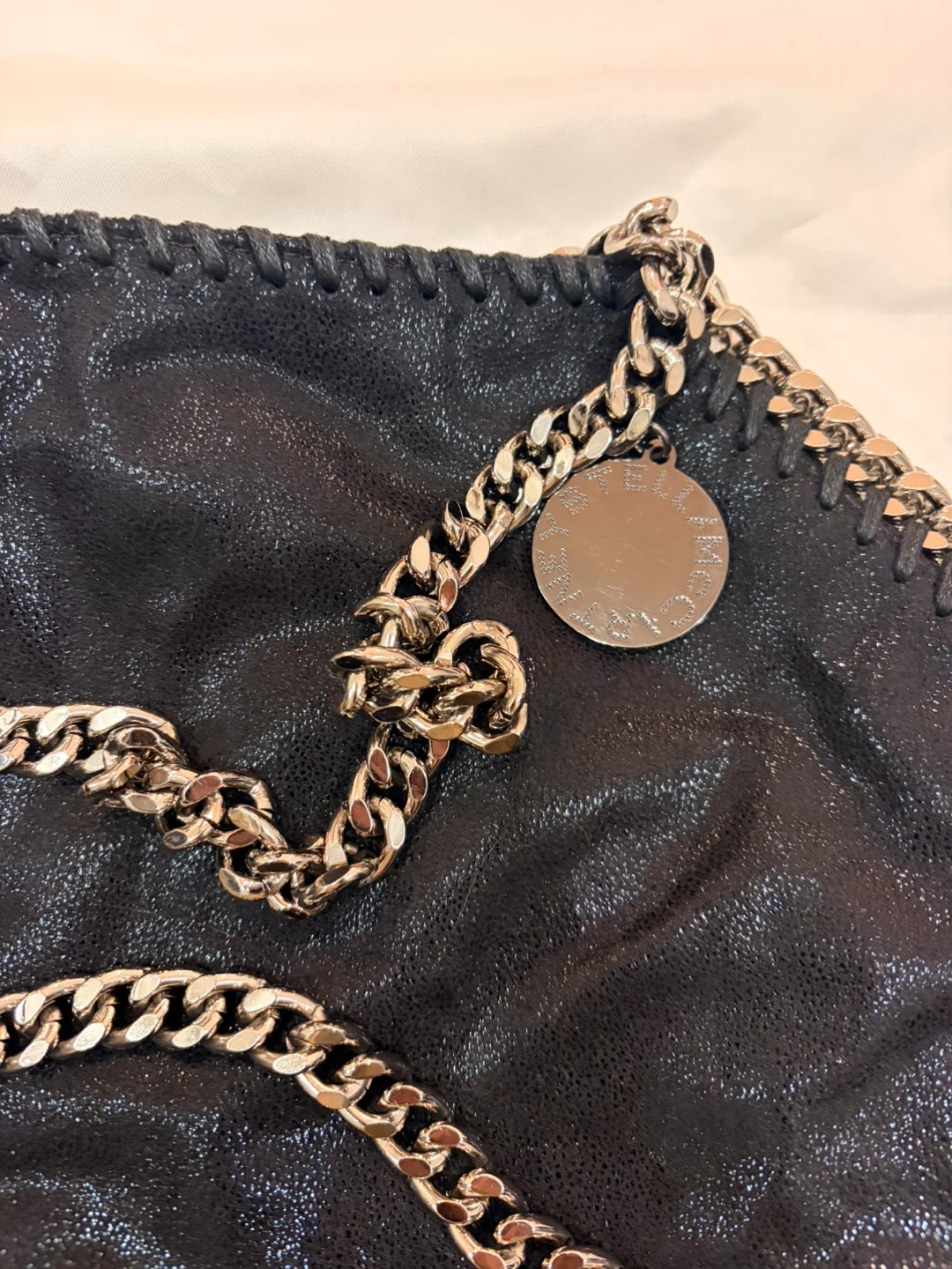 This is a Stella McCartney Falabella like black faux leather tote bag with a silver diamond-cut chain trim.