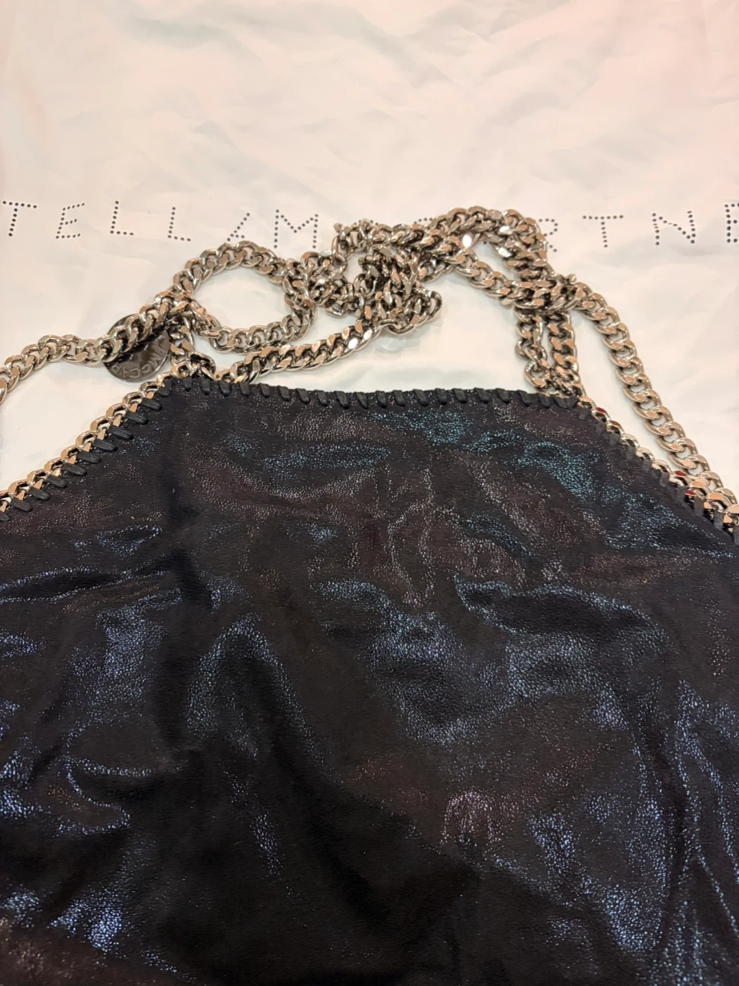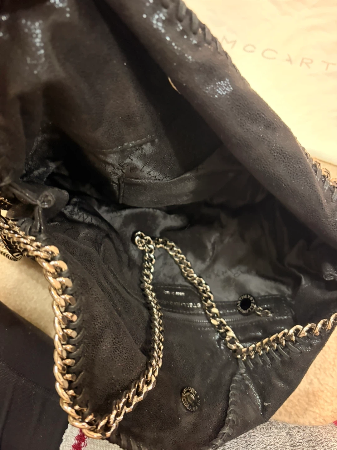 This is a Stella McCartney Falabella like black faux leather tote bag with a silver diamond-cut chain trim.