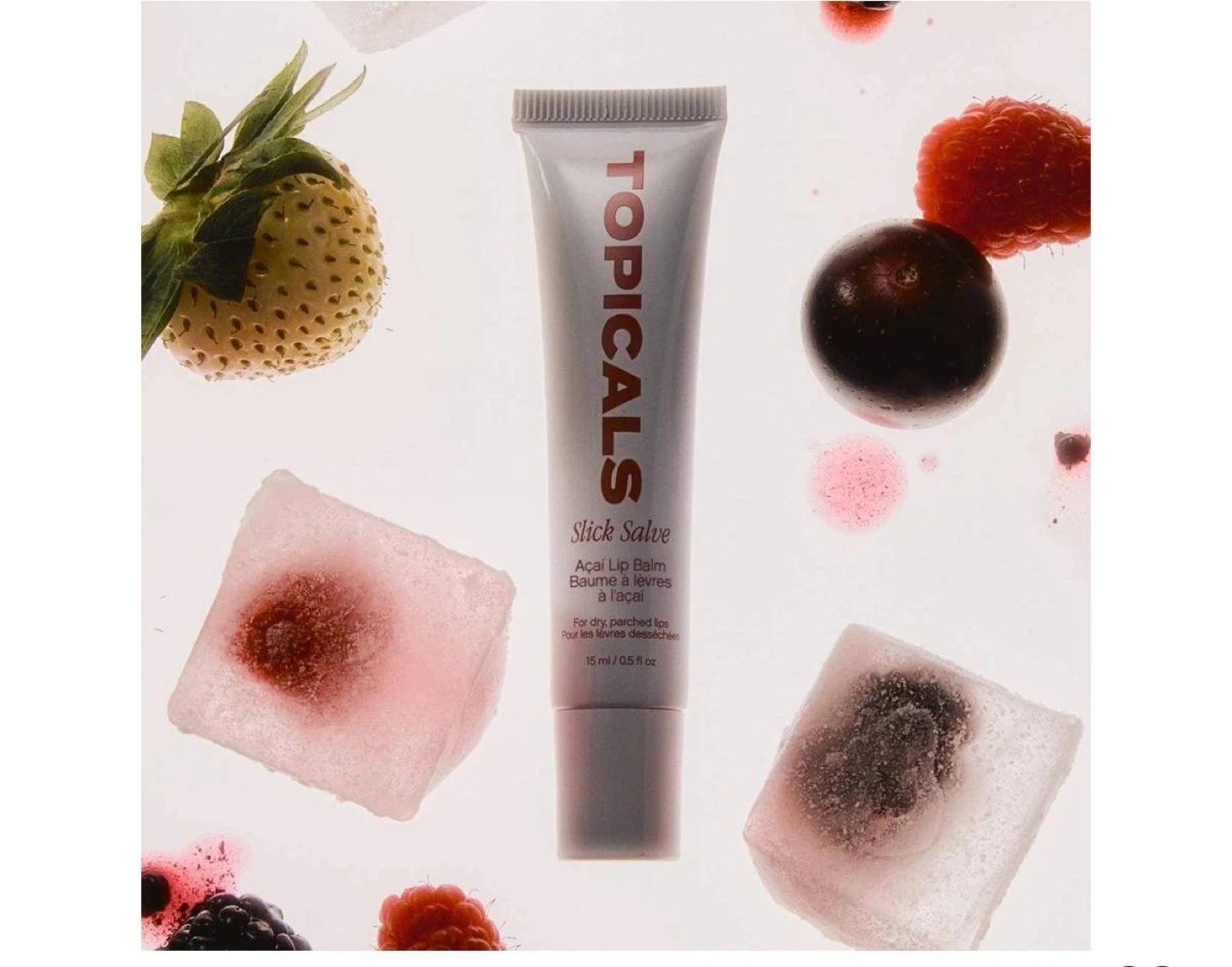 Hydrating TOPICALS Slick Salve Glossy Lip Balm. This is the Acai flavor, perfect for dry, parched lips. It relieves severe dryness and strengthens your moisture barrier. Has long-lasting hydration and soothes discomfort. 100% Vegan + Cruelty free. Contains good stuff like Rice Bran Wax, Hyaluronic Acid, Ceramides, and Glycerin. Comes in a 15 ml / 0.5 fl oz tube.