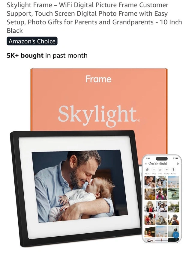 Display your cherished memories with this Skylight Digital Picture Frame, featuring a 10-inch touch screen and easy setup for sharing photos with family. This item is in excellent, like new condition. Comes with original packaging and accessories. Share your photos effortlessly via WiFi! This frame makes a great gift or a wonderful addition to any home. Key features include a 10-inch touch screen display, WiFi connectivity for easy photo sharing, and simple setup. If the ad is up, the frame is available.
