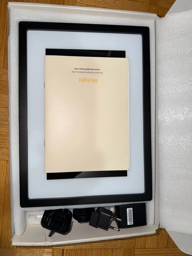 Display your cherished memories with this Skylight Digital Picture Frame, featuring a 10-inch touch screen and easy setup for sharing photos with family. This item is in excellent, like new condition. Comes with original packaging and accessories. Share your photos effortlessly via WiFi! This frame makes a great gift or a wonderful addition to any home. Key features include a 10-inch touch screen display, WiFi connectivity for easy photo sharing, and simple setup. If the ad is up, the frame is available.