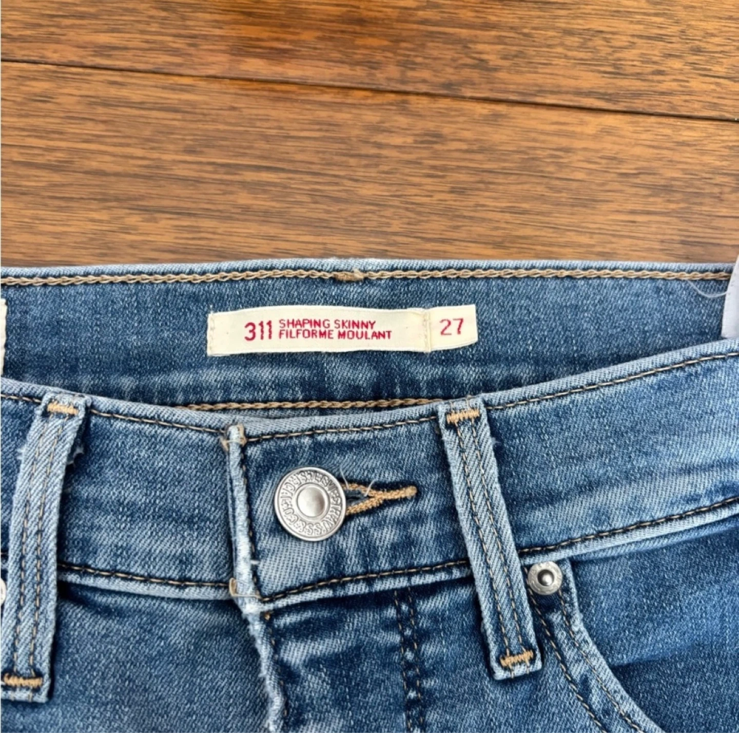Levi's 311 Shaping Skinny Jeans in a classic blue wash. Women's size 27. These jeans are designed for a flattering fit. Denim material.