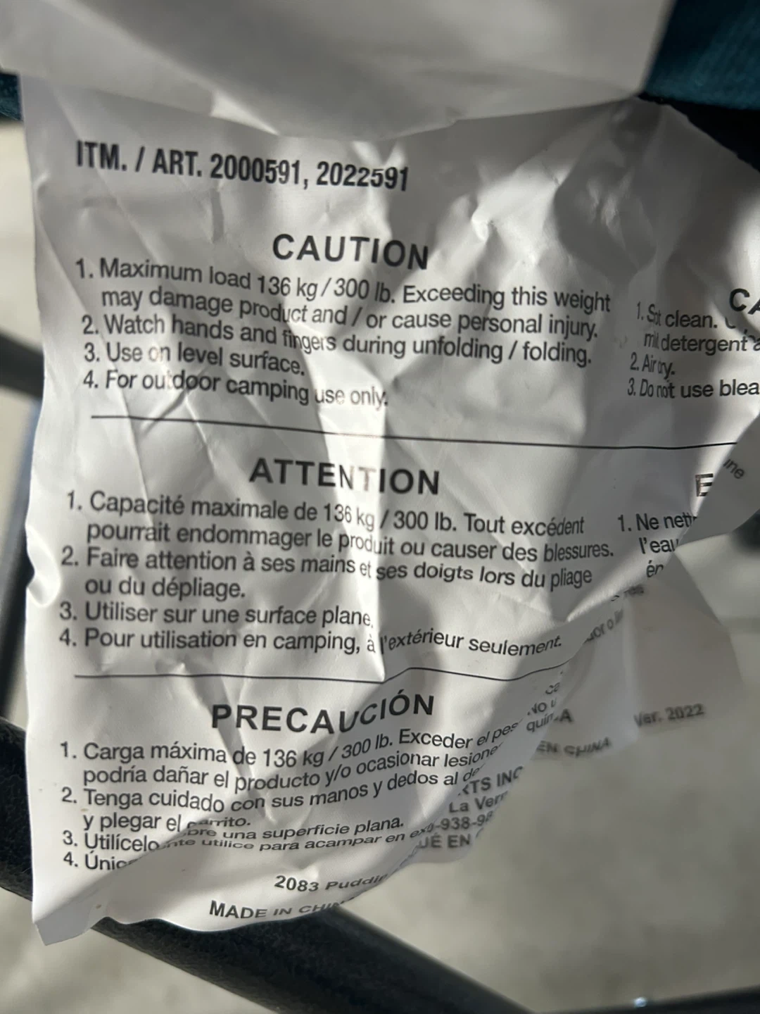 Comfy folding extra padded chair. Teal color, comes with a carry bag. Holds up to 300 lbs. Good for outdoor camping. Has a small burn mark and stain on the seat, otherwise in good condition.