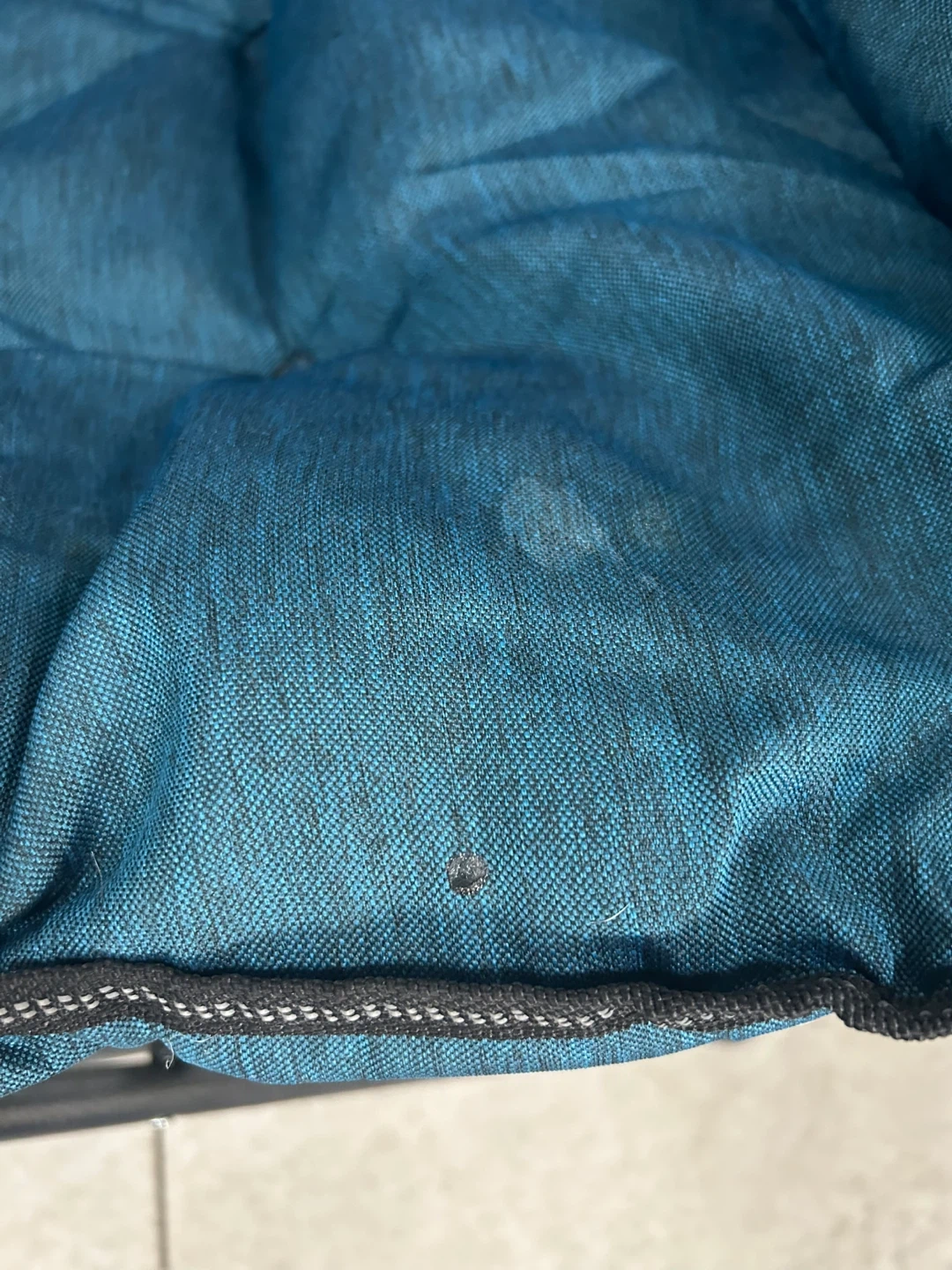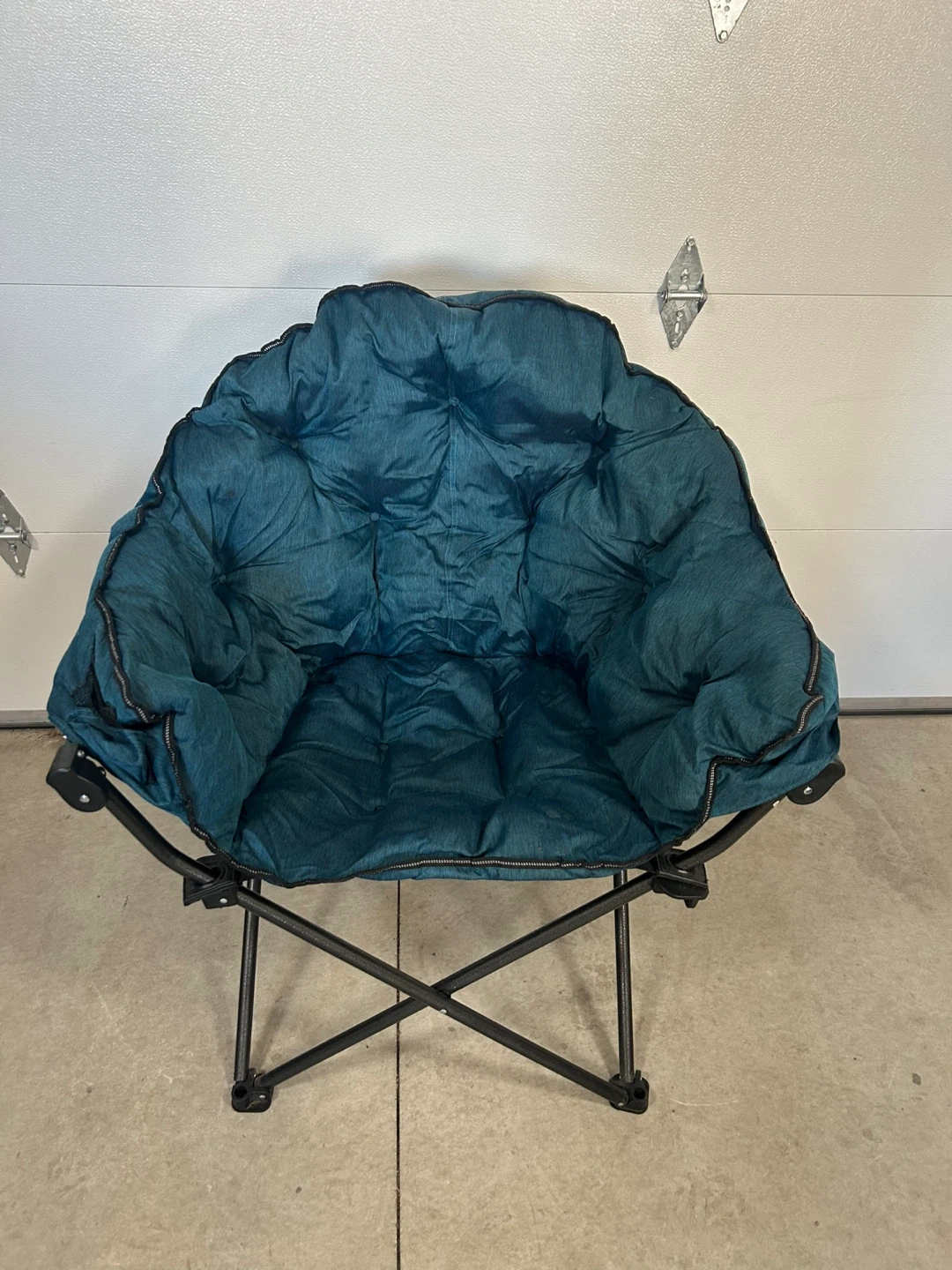 Comfy folding extra padded chair. Teal color, comes with a carry bag. Holds up to 300 lbs. Good for outdoor camping. Has a small burn mark and stain on the seat, otherwise in good condition.