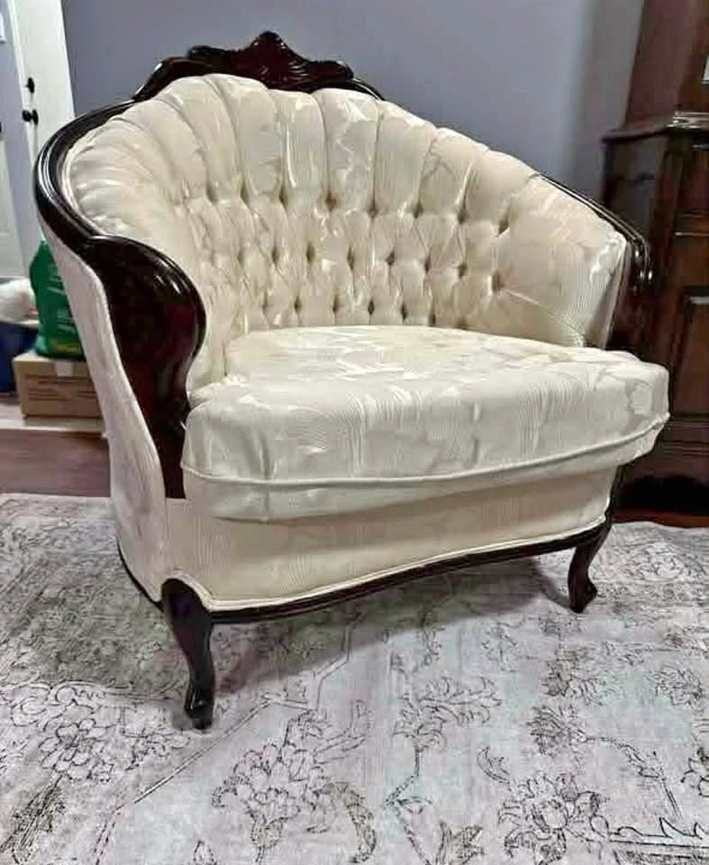Vintage French Provincial Carved Wood Cream Armchair & Loveseat