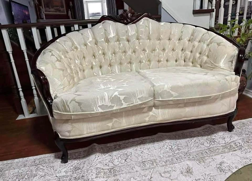 Elegant matching set with one armchair and one loveseat. Features carved dark wood frames and tufted backs. Upholstery is a light cream/off-white fabric with a subtle gingko leaf pattern. Moving and will not fit in my new place. Pick up only near Queen and Chingacousy Rd in Brampton.