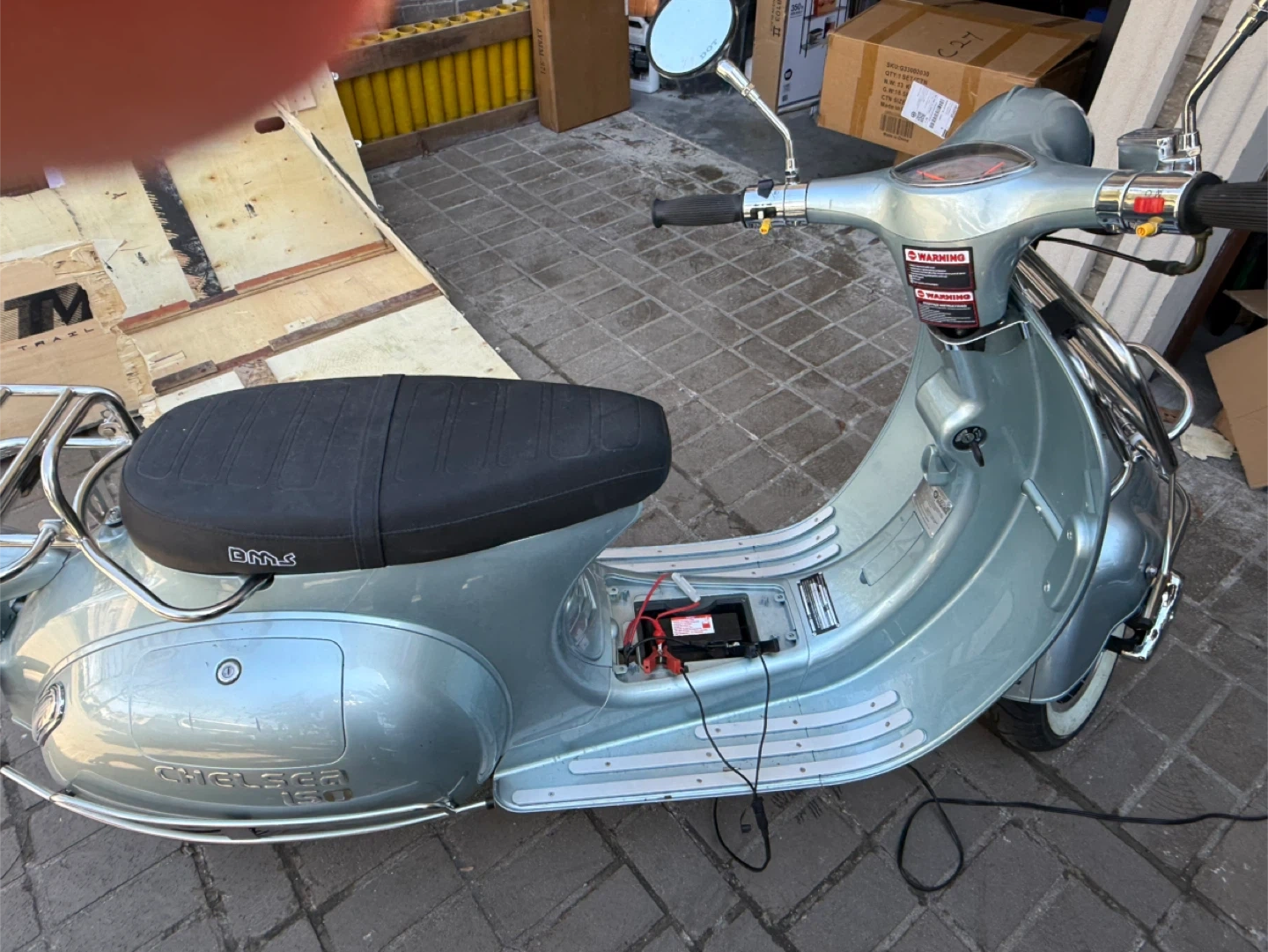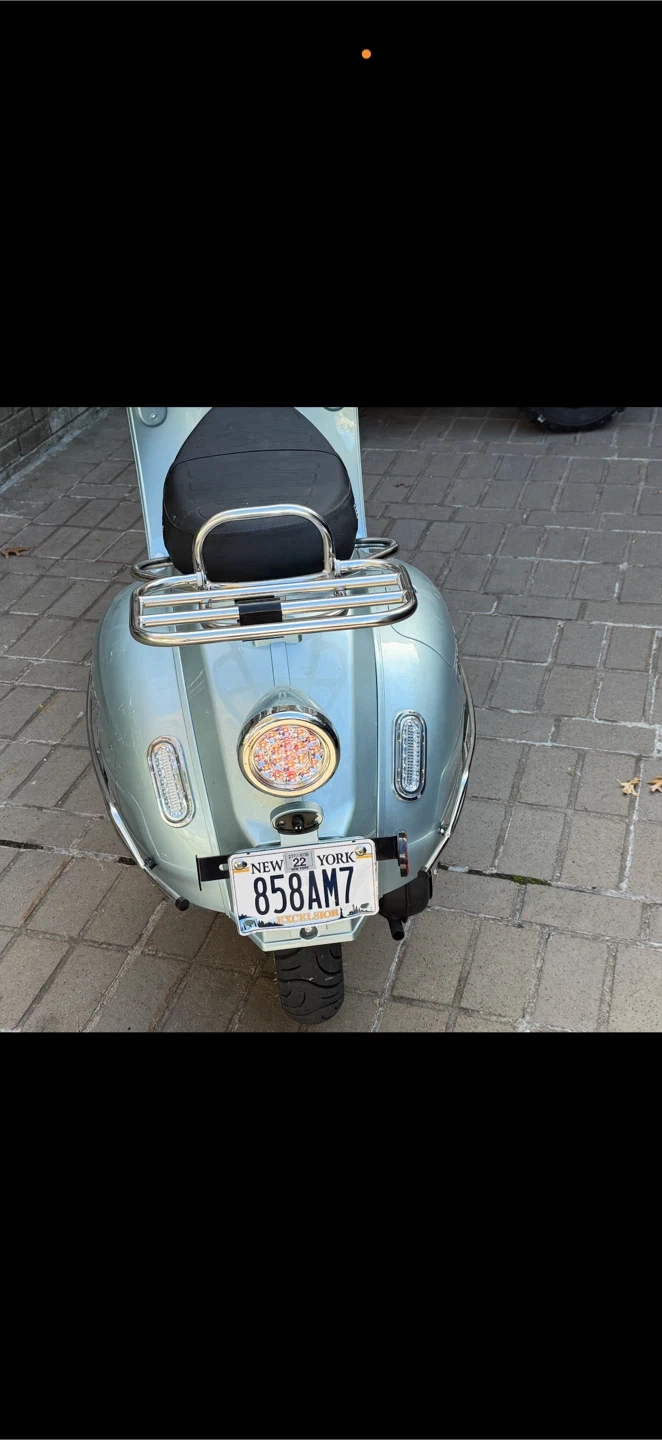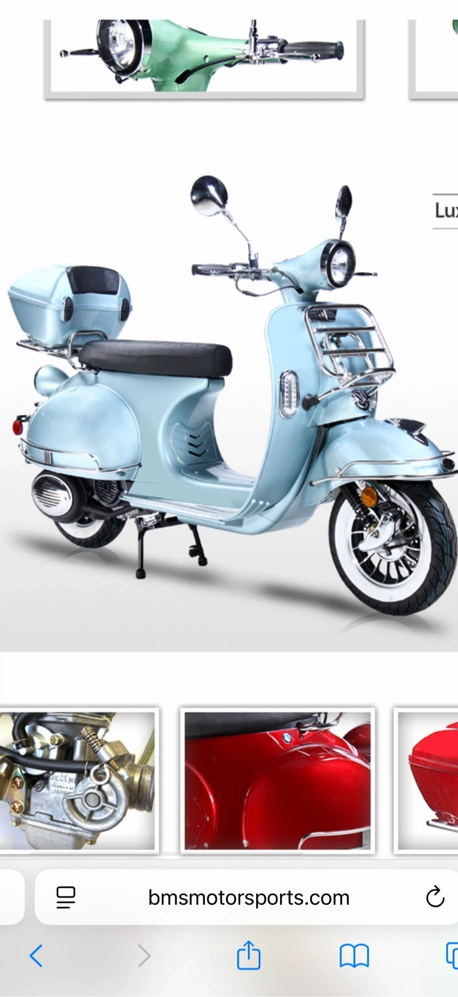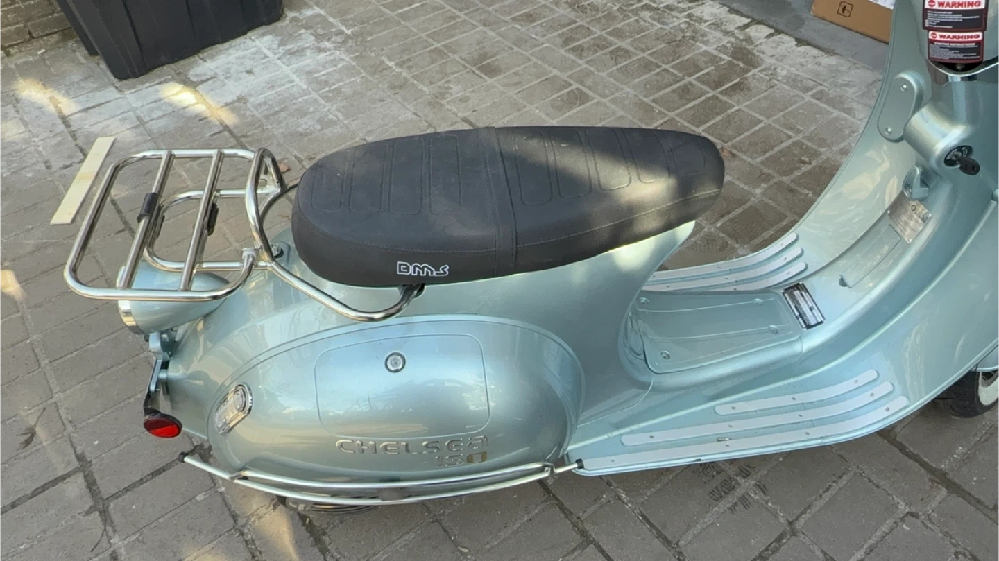 BMS Motorsports Chelsea 150cc scooter in a light blue finish. Features a comfortable black seat with the BMS logo and a rear luggage rack. It's equipped with chrome accents and white-wall tires. This scooter provides a stylish and practical way to get around town!