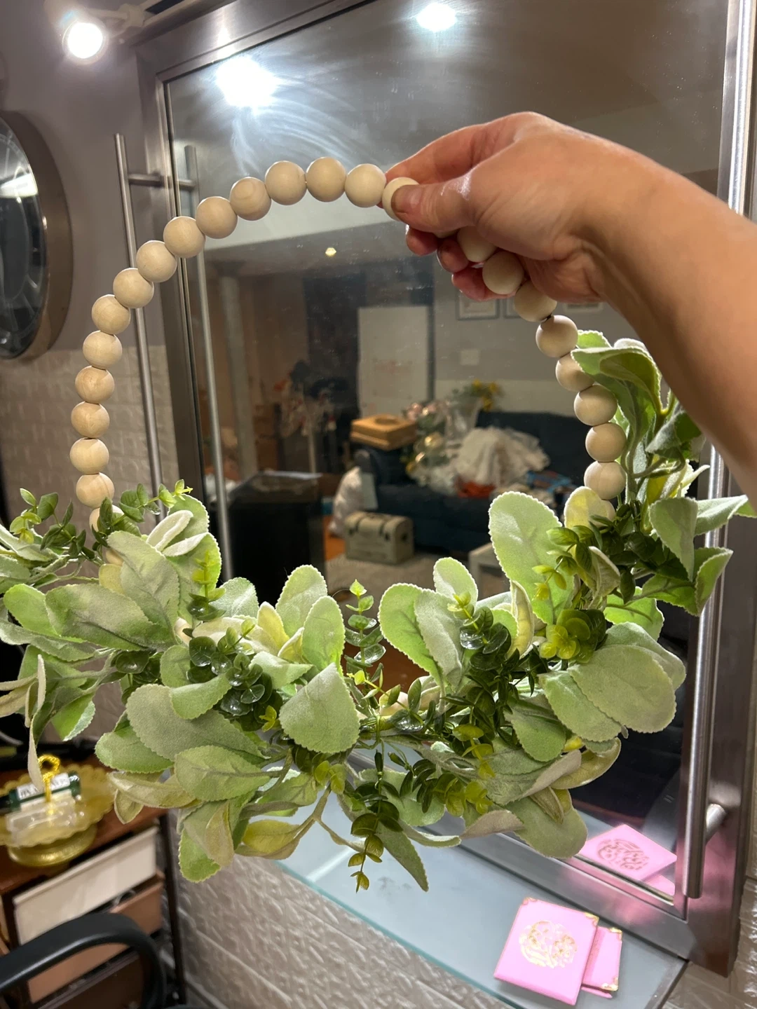 This decorative wreath features a strand of natural wood beads and a faux greenery arrangement. It's a lovely piece for adding a touch of nature to your home decor. The greenery includes a mix of light and dark green leaves.