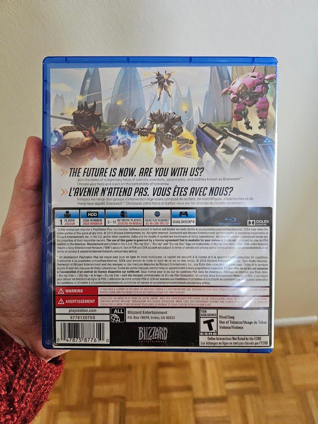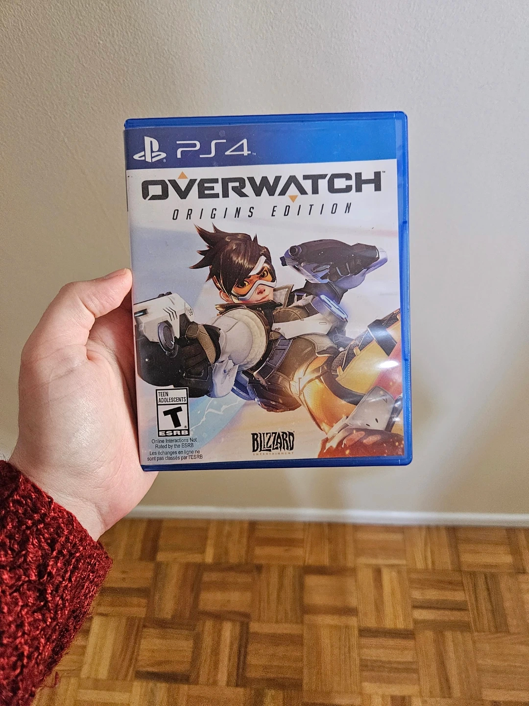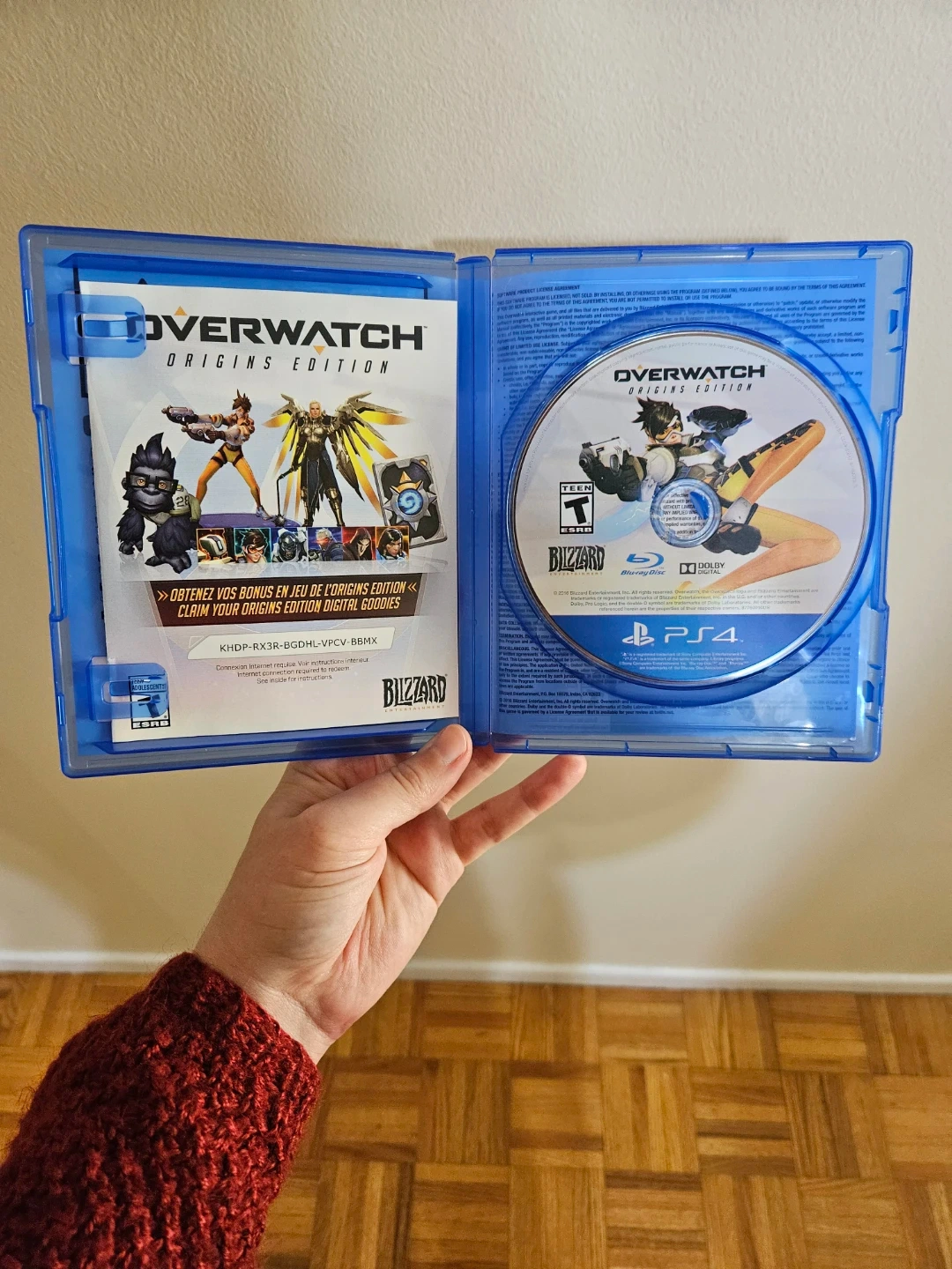 This is the Overwatch Origins Edition for PlayStation 4. It's a popular first-person shooter game developed by Blizzard Entertainment. The Origins Edition includes base game content plus digital bonuses.
