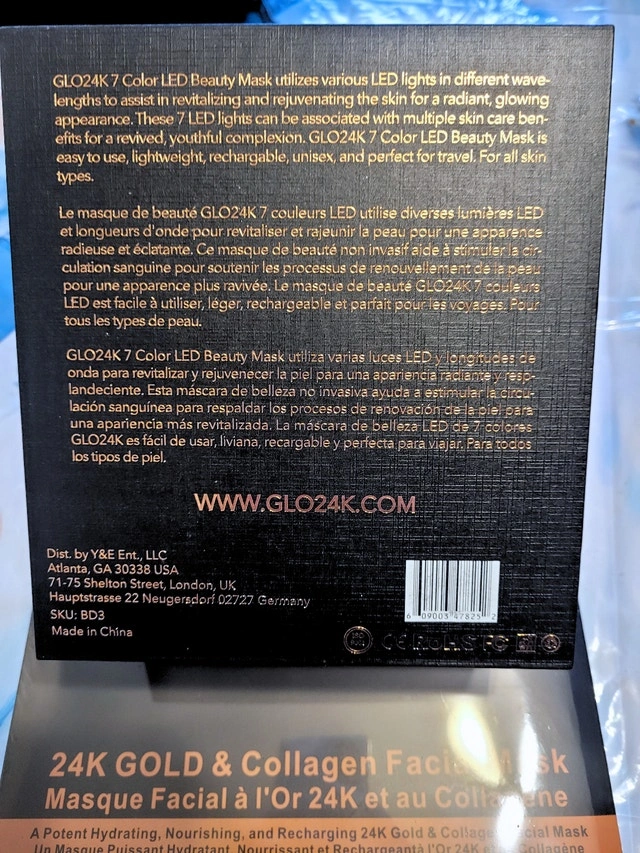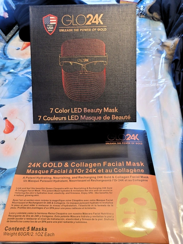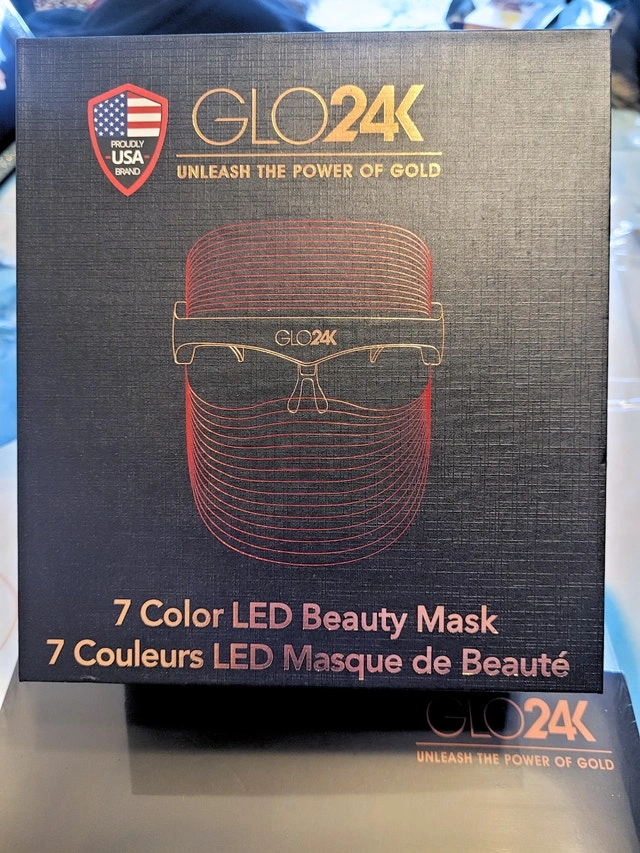 Brand new in the box! This bundle includes the GLO24K LED Beauty Mask, charger cable, user manual, and a 5-pack of GLO24K Gold and Collagen Facial Masks. The LED mask is designed for a spa-at-home experience with seven different light settings to enhance your skin. The nourishing masks hydrate, revitalize, and help restore skin's elasticity and firmness for a radiant glow. Suitable for all skin types. Pick up at Sheppard & Don Mills. Cash or cashless payment accepted.