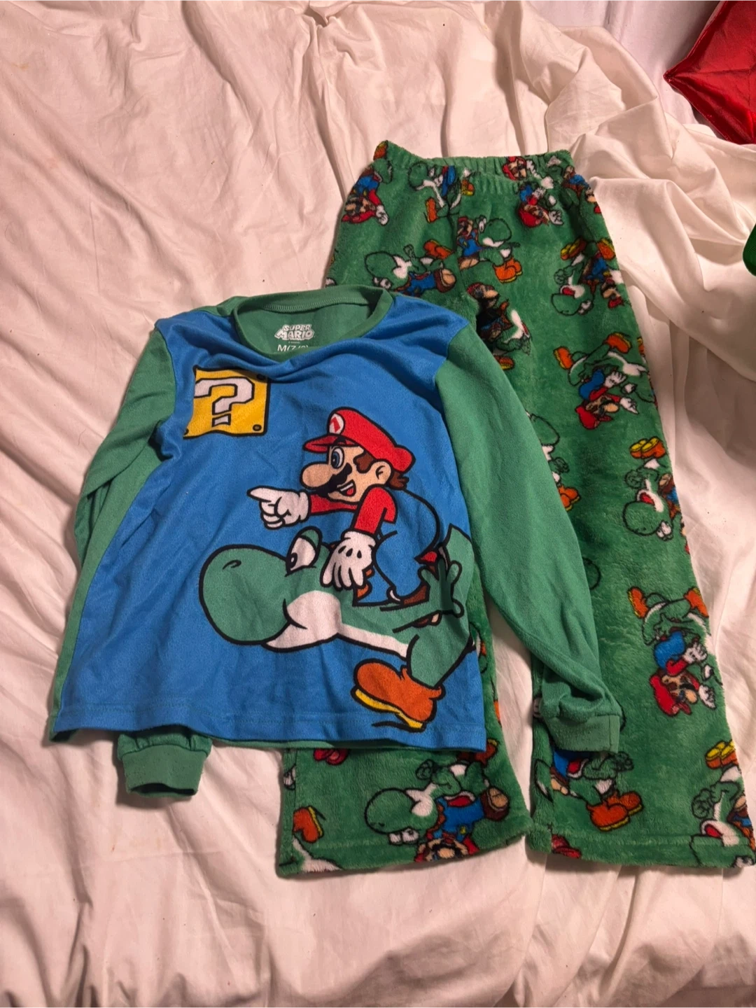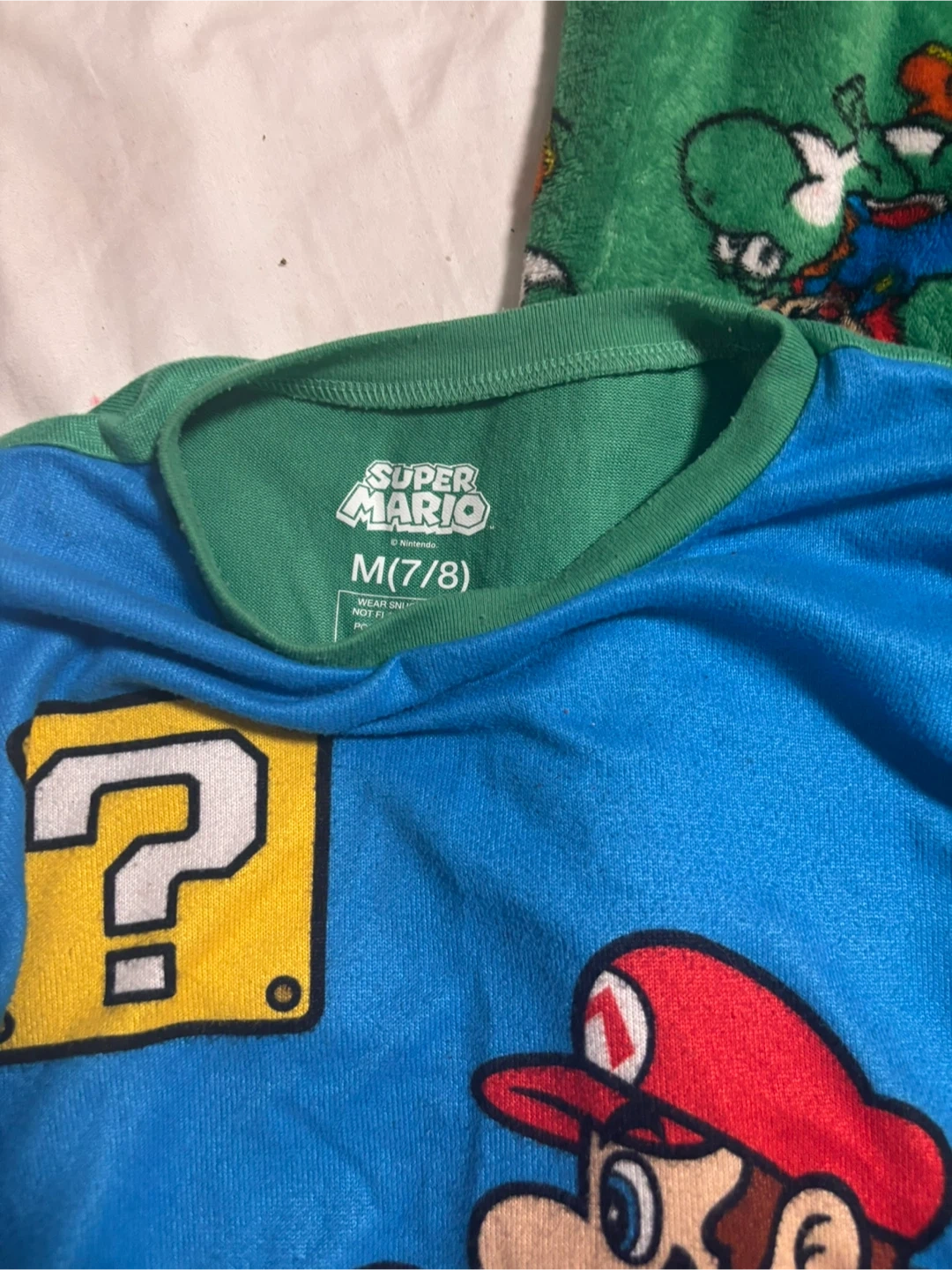 Super cute Super Mario pajama set for kids! The top is blue with a Mario design, and the pants are green with Yoshi. Size is M (7/8). Perfect for any young Nintendo fan!