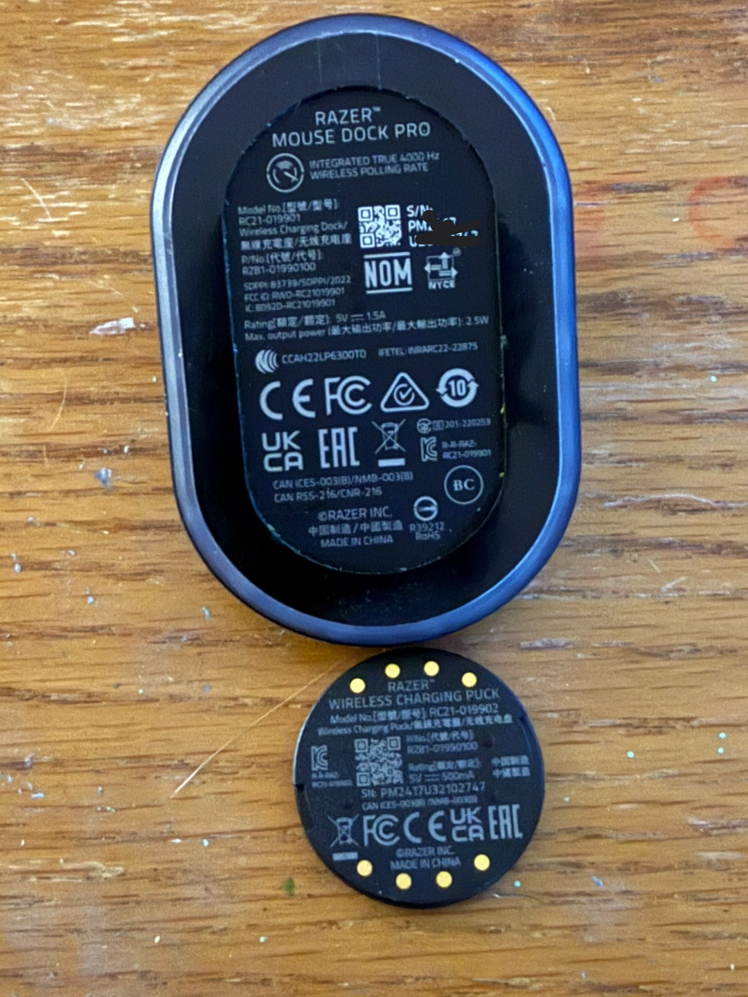 Selling a Razer Mouse Dock Pro with Wireless Charging Puck. It features integrated true 4000 Hz wireless polling rate. Model number is RC21-019903. It has a rating of 5V 1.5A and a max output power of 2.5W.