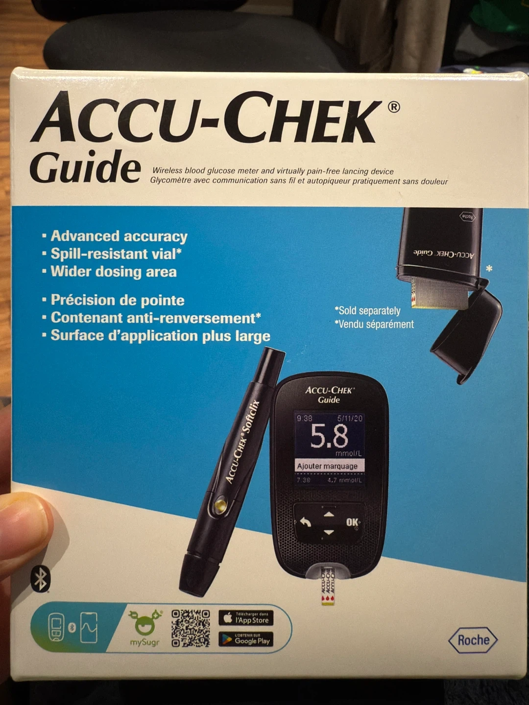 Selling a brand new Accu-Chek Guide blood glucose meter, still sealed in its box! It's a wireless glucose meter with a virtually pain-free lancing device. Features include advanced accuracy and a spill-resistant vial