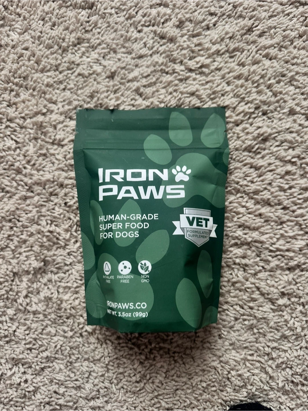 This is Iron Paws human-grade super food supplement for dogs. It's formulated by veterinarians to ensure your dog gets everything their diet is missing. Net wt. 3.5oz (99g). Unopened/brand new
