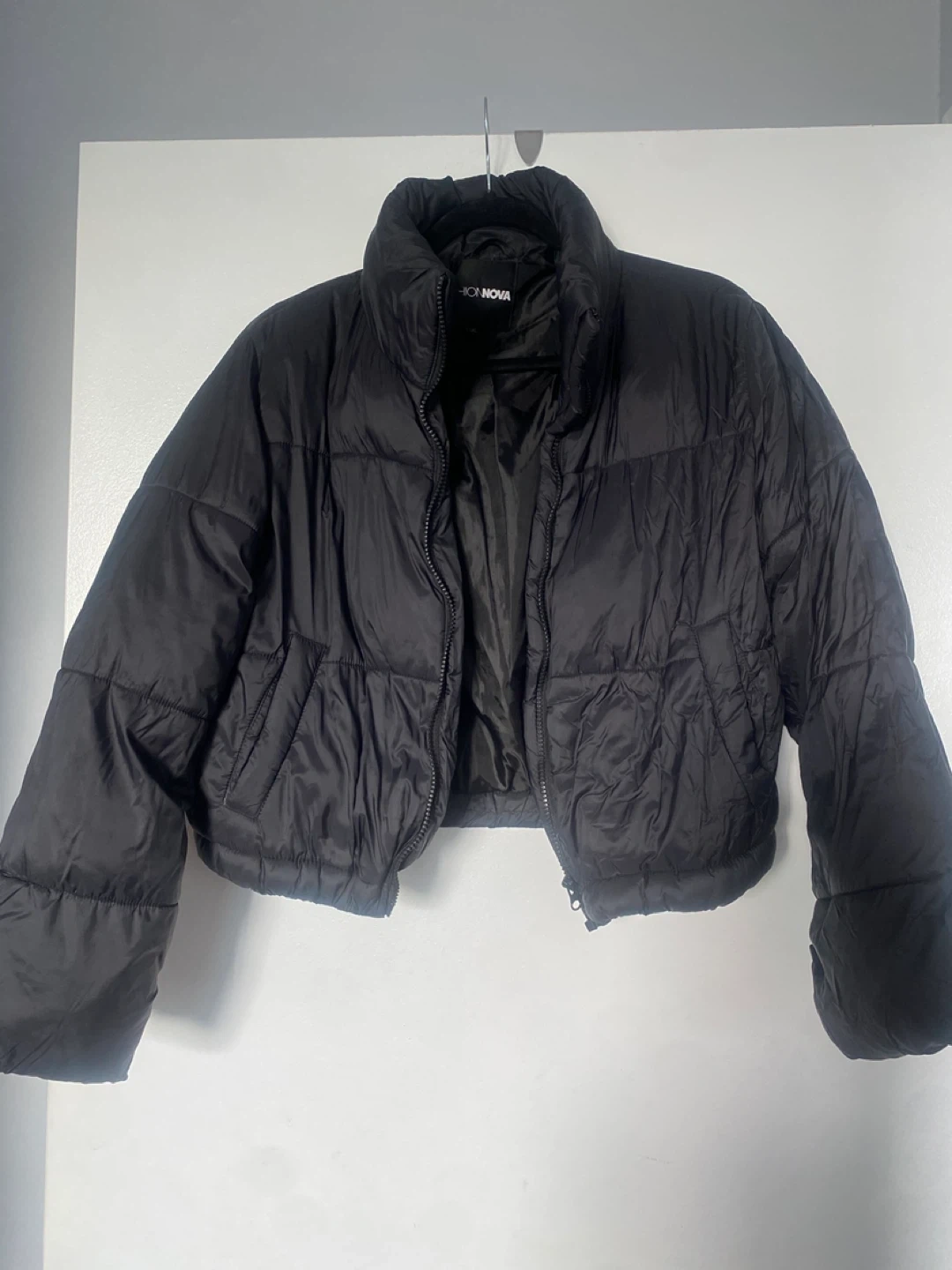 Here's a gently used black puffer jacket from FASHION NOVA in size M. It's in great condition and ready to keep you warm! Lightweight