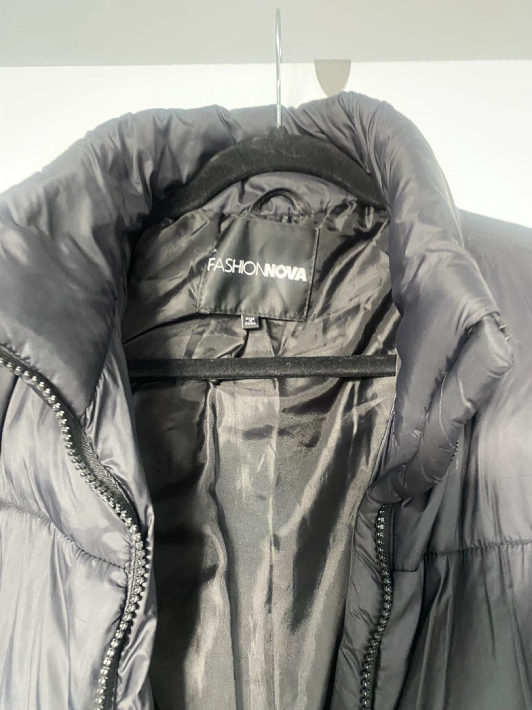 Here's a gently used black puffer jacket from FASHION NOVA in size M. It's in great condition and ready to keep you warm! Lightweight