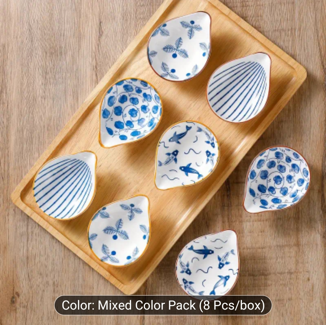 These adorable ceramic sauce dishes come in a mixed color pack with 8 pieces in the box. They feature various blue and white patterns. Each dish weighs 65g and measures approximately 3.74 inches in height and 2.95 inches in width. Perfect for adding a touch of charm to your table!