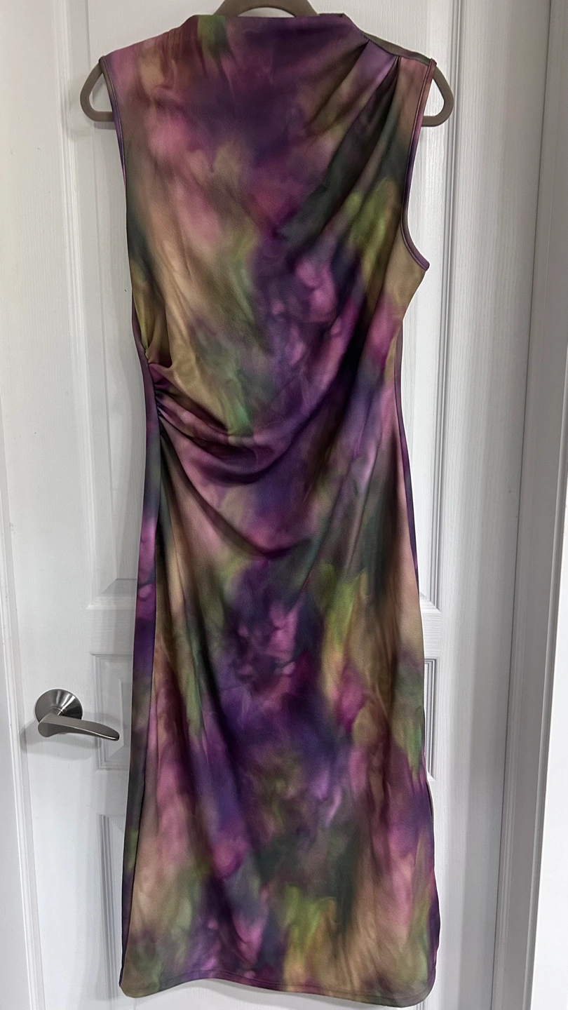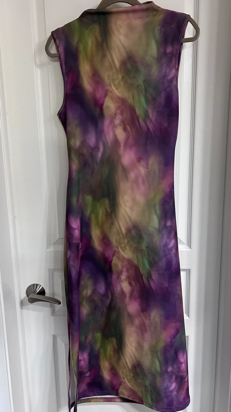 Beautiful sleeveless midi dress. Features a mock neck and tie-dye pattern in shades of purple, green, and brown. Fitted silhouette. Side slit. Size XL but its small for XL