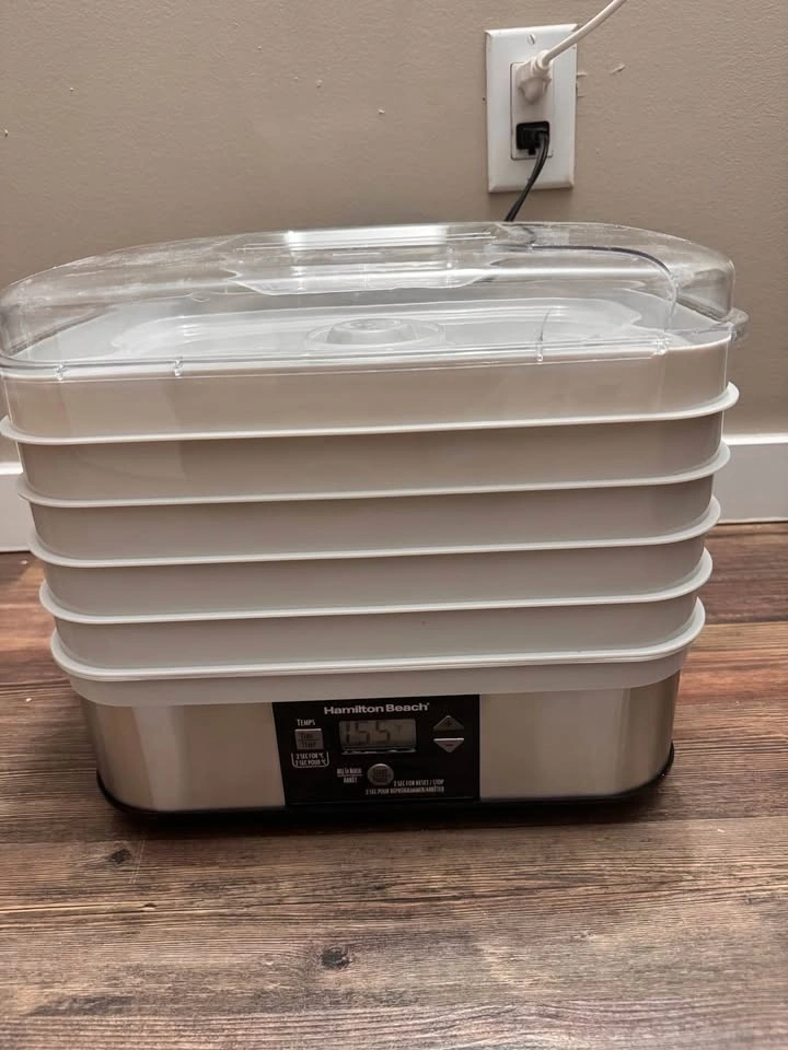 Used food dehydrator in working condition. Great for drying fruits, vegetables, herbs, or making jerky. The unit functions properly, but the plastic lid has a crack (see photo). It still sits on top and can be used, but it’s not in perfect condition. Because of this, the price reflects the damage. Includes multiple drying trays. Good option if you need a dehydrator for basic use or for parts.