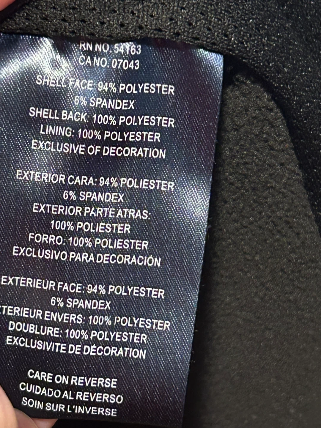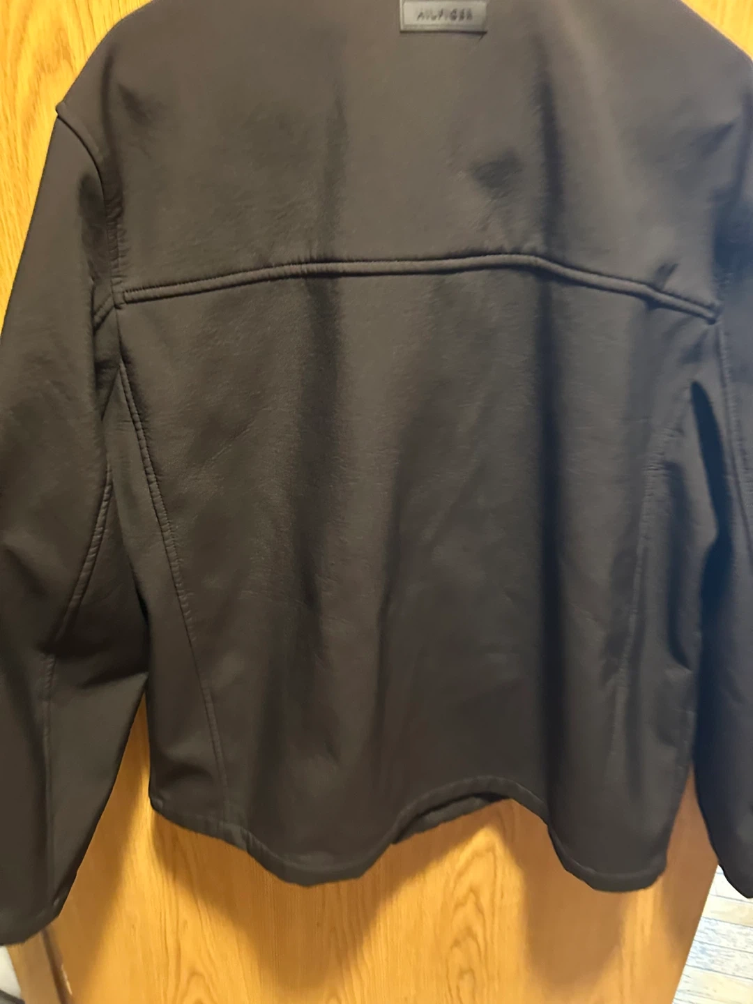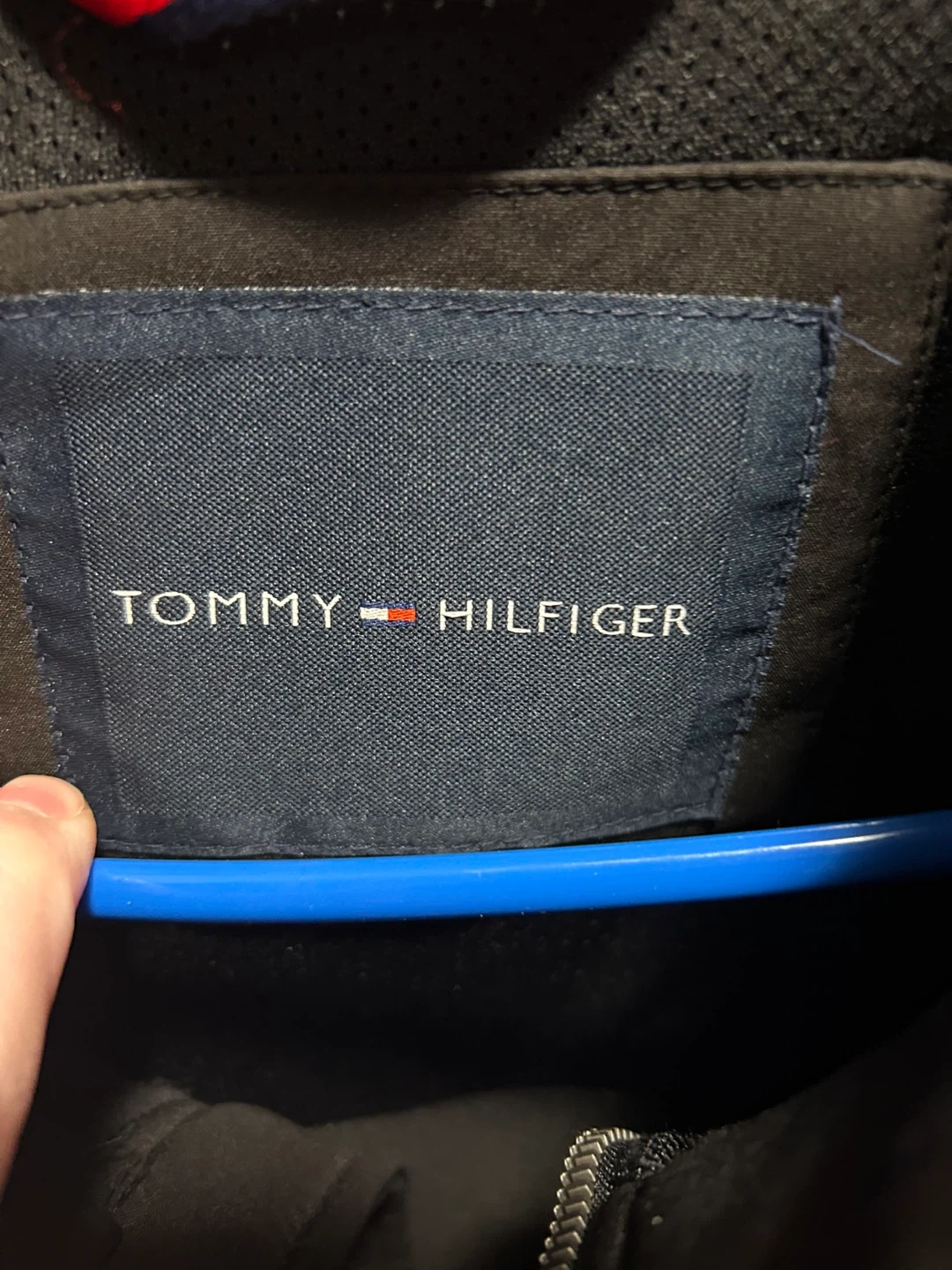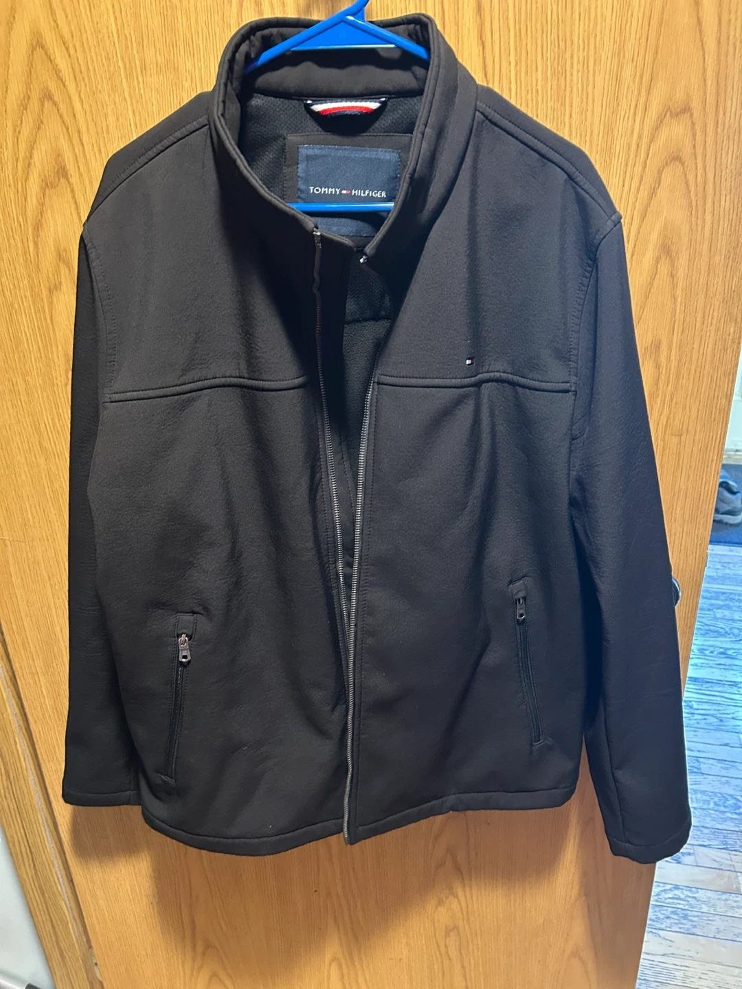 Tommy Hilfiger men's jacket in black. It's a size XL, made with a shell face of 94% polyester and 6% spandex, and a lining of 100% polyester. This jacket is great for layering during cooler weather!