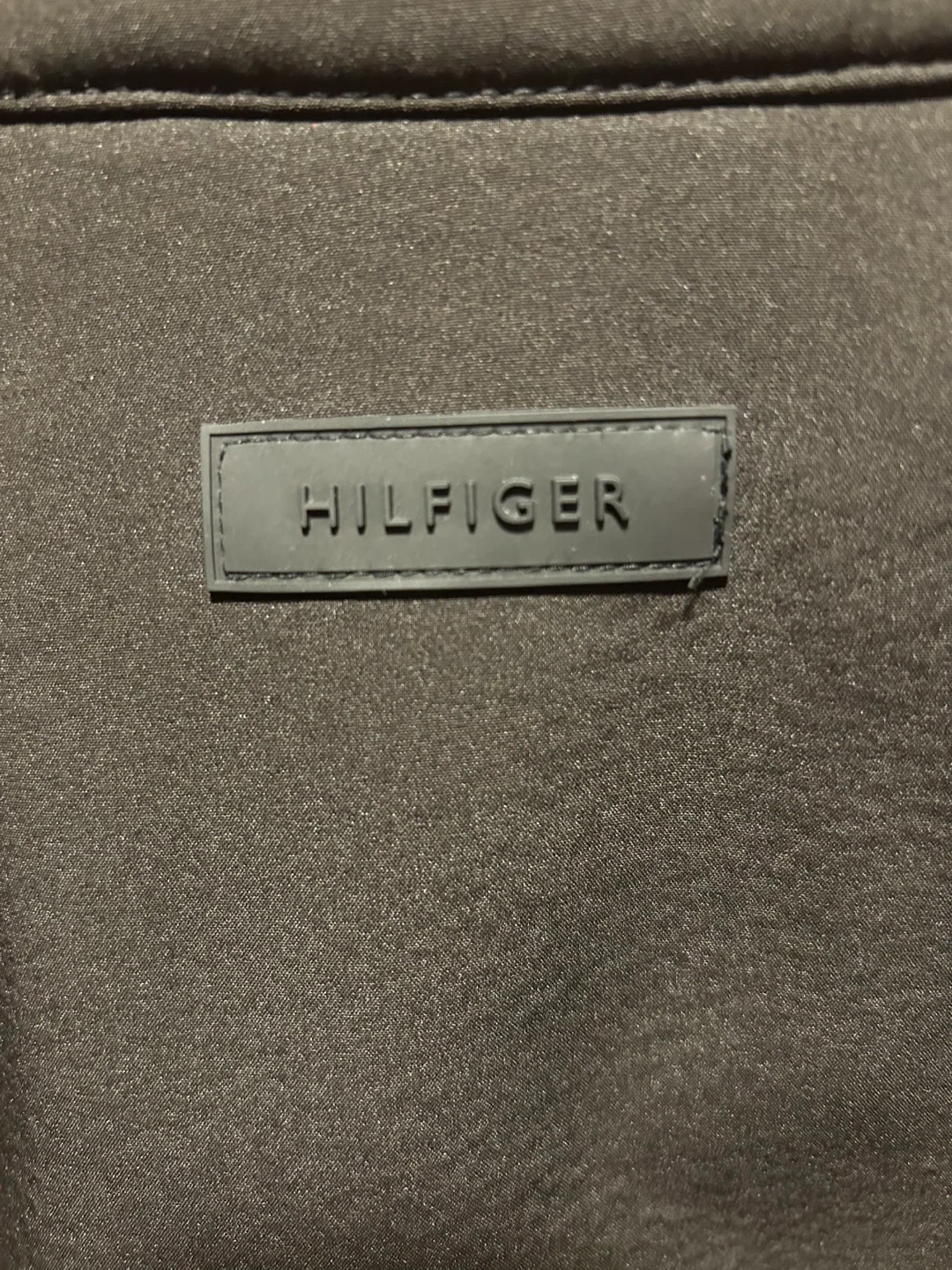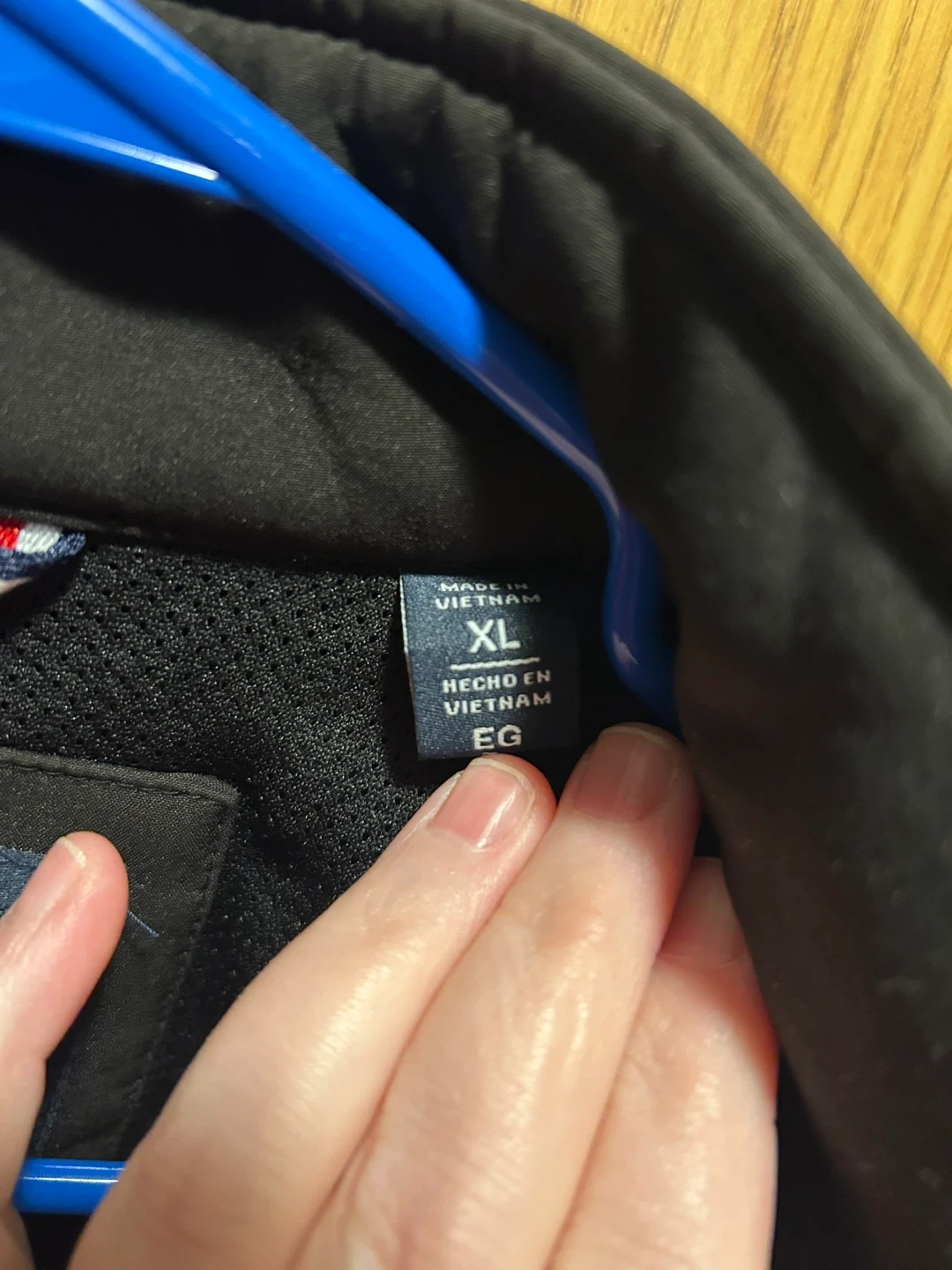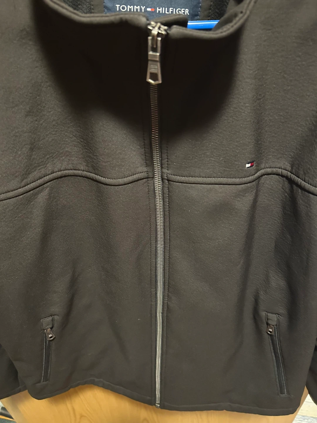 Tommy Hilfiger men's jacket in black. It's a size XL, made with a shell face of 94% polyester and 6% spandex, and a lining of 100% polyester. This jacket is great for layering during cooler weather!