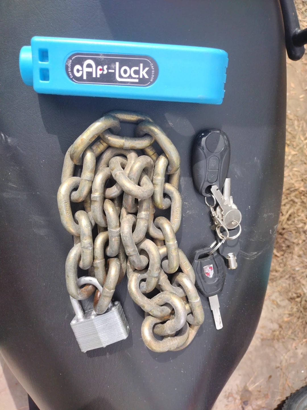 - I included a Capslock, a heavy chain and lock for the front wheel, and a spare key along with a charger.