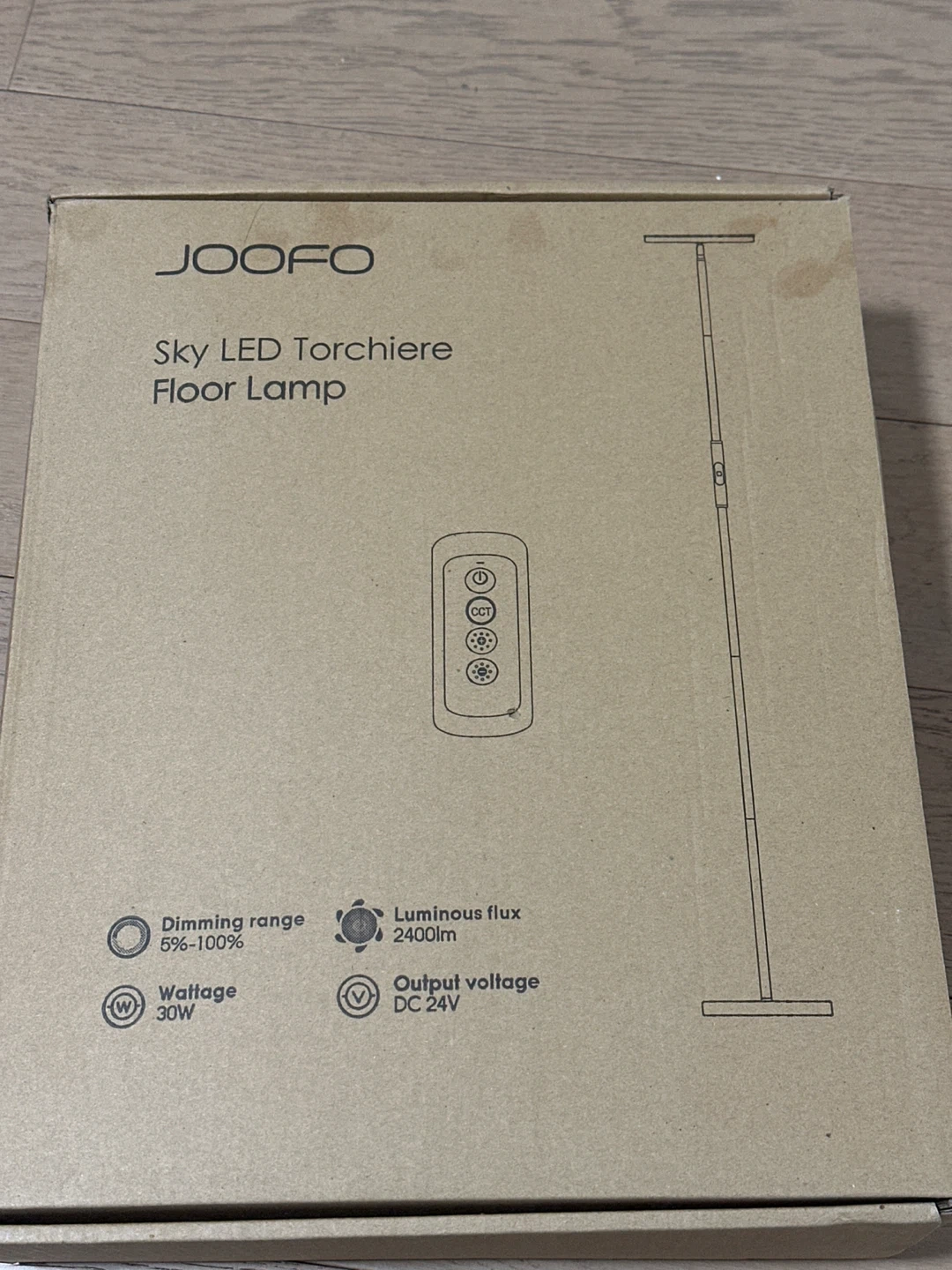 JOOFO Sky LED Torchiere Floor Lamp. It's 68.9 inches tall with a 9.85 inch base. Features dimming range from 5%-100%, 2400lm luminous flux, and 30W power. Includes a remote for operation.