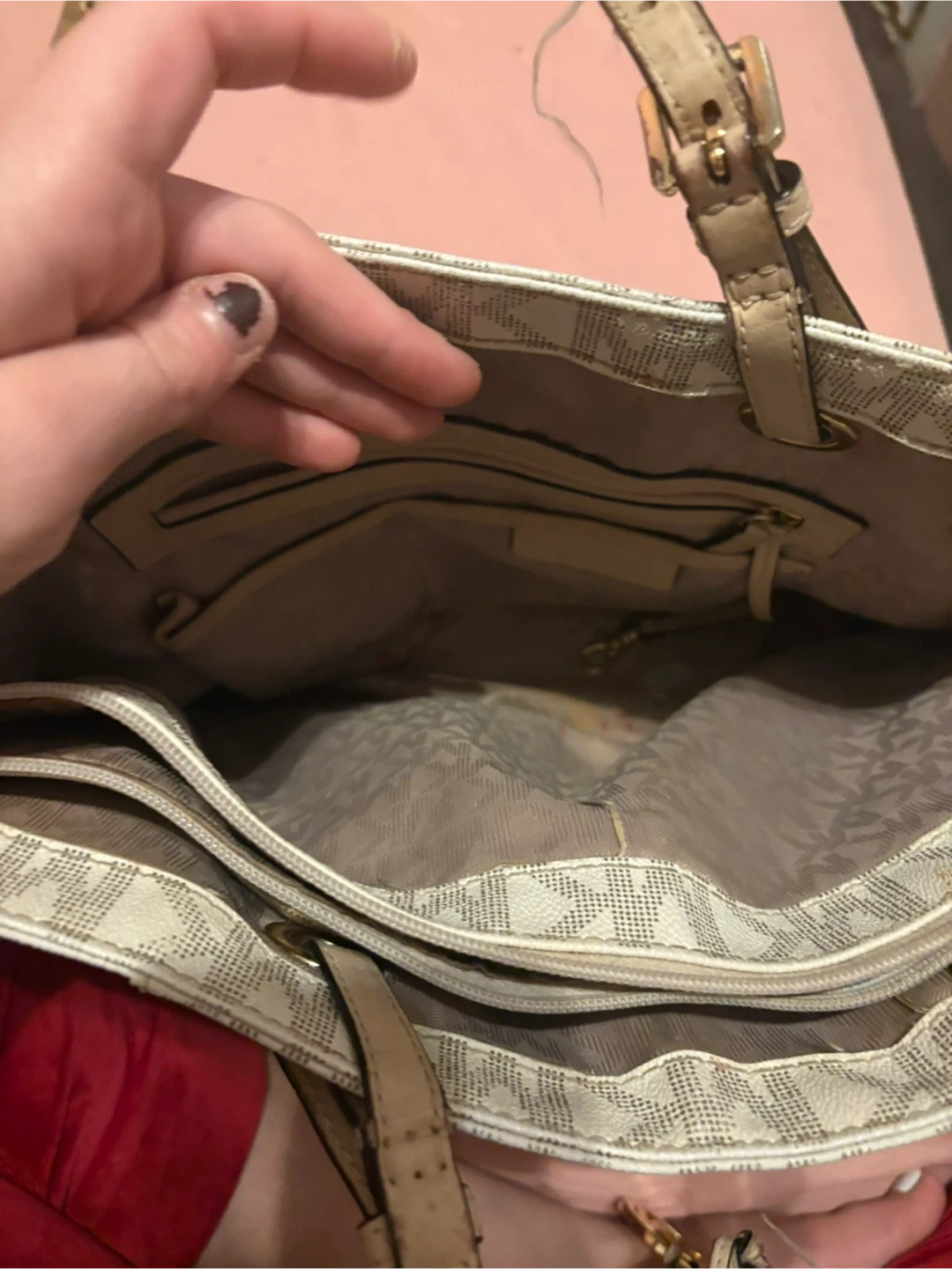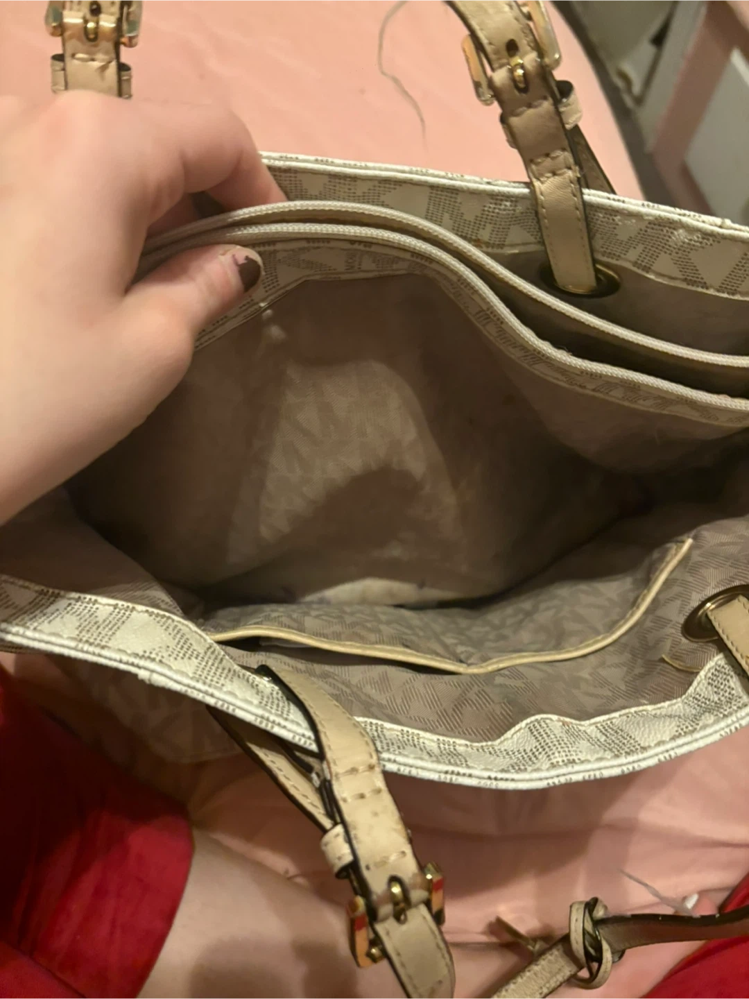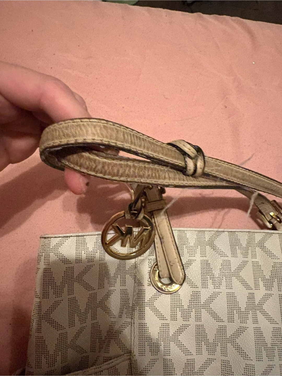 Selling a Michael Kors tote bag. It has a beige and white monogram pattern. The bag shows signs of wear on the straps and exterior, but is still in good condition for daily use. It's a stylish and functional bag perfect for carrying your essentials!