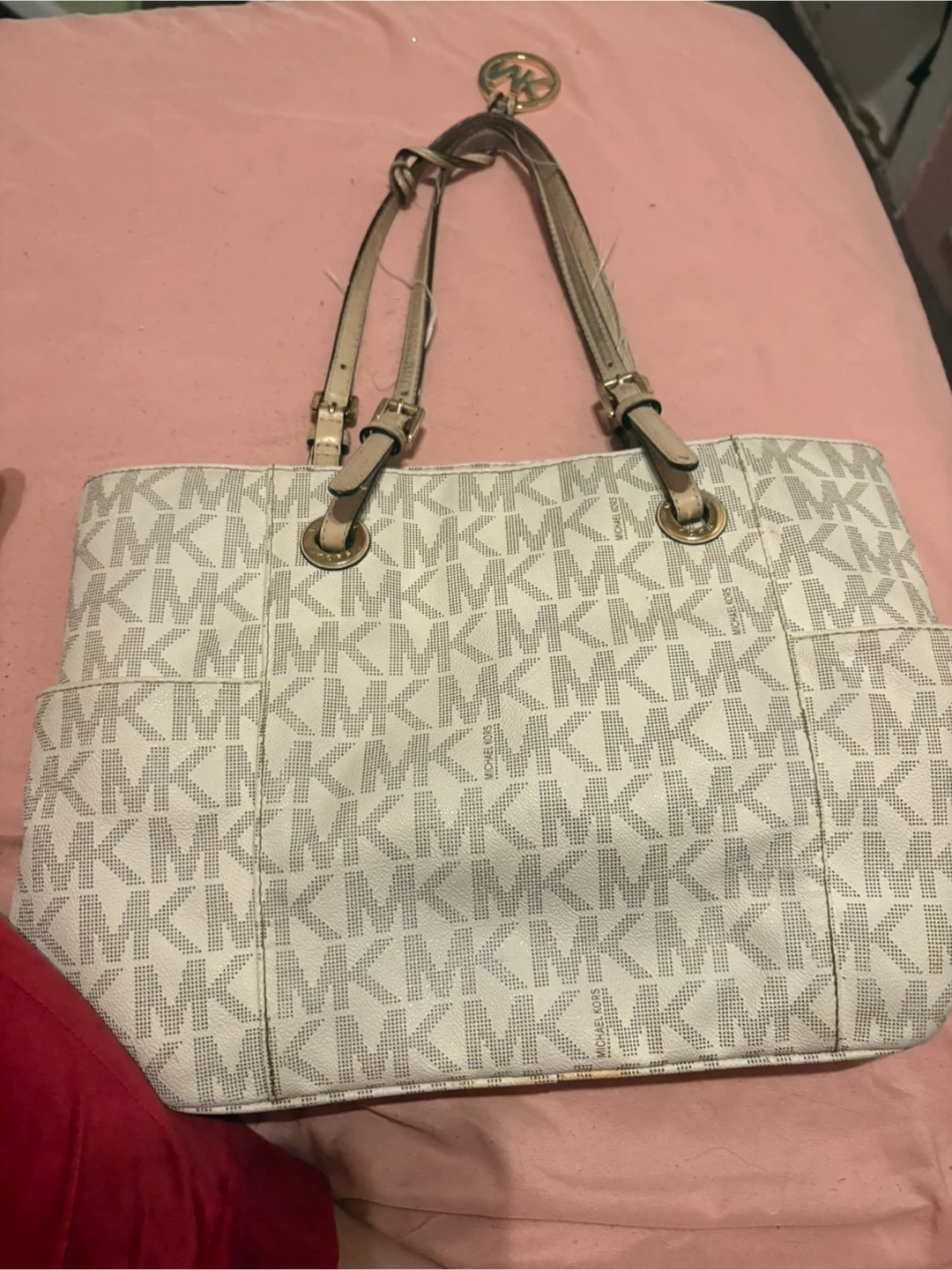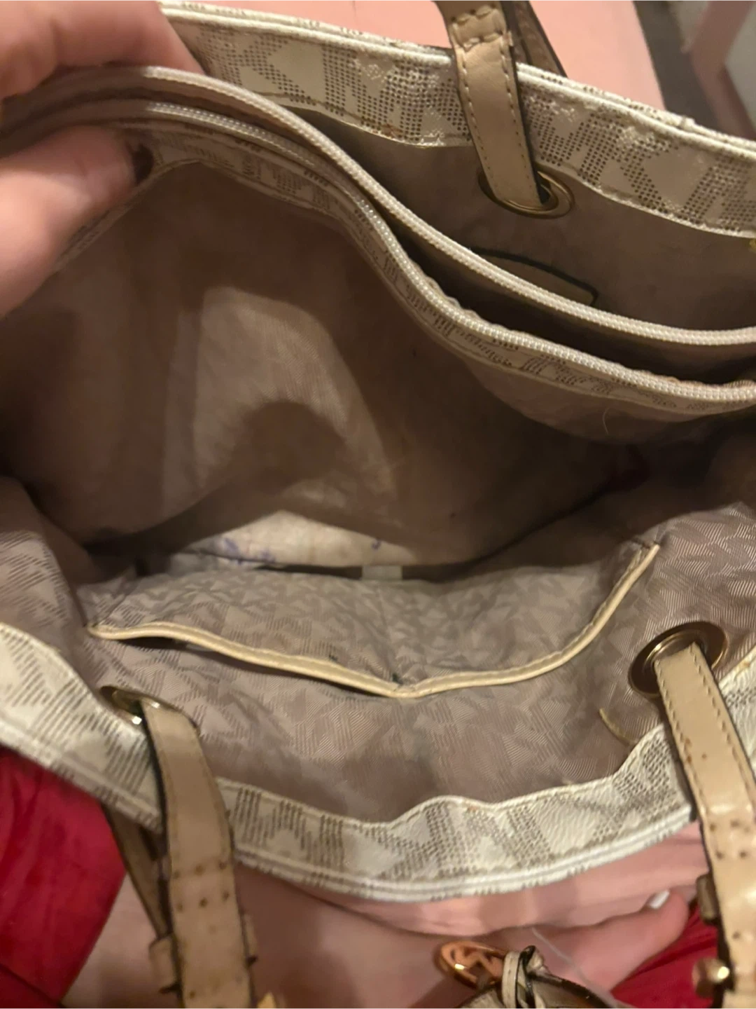 Selling a Michael Kors tote bag. It has a beige and white monogram pattern. The bag shows signs of wear on the straps and exterior, but is still in good condition for daily use. It's a stylish and functional bag perfect for carrying your essentials!
