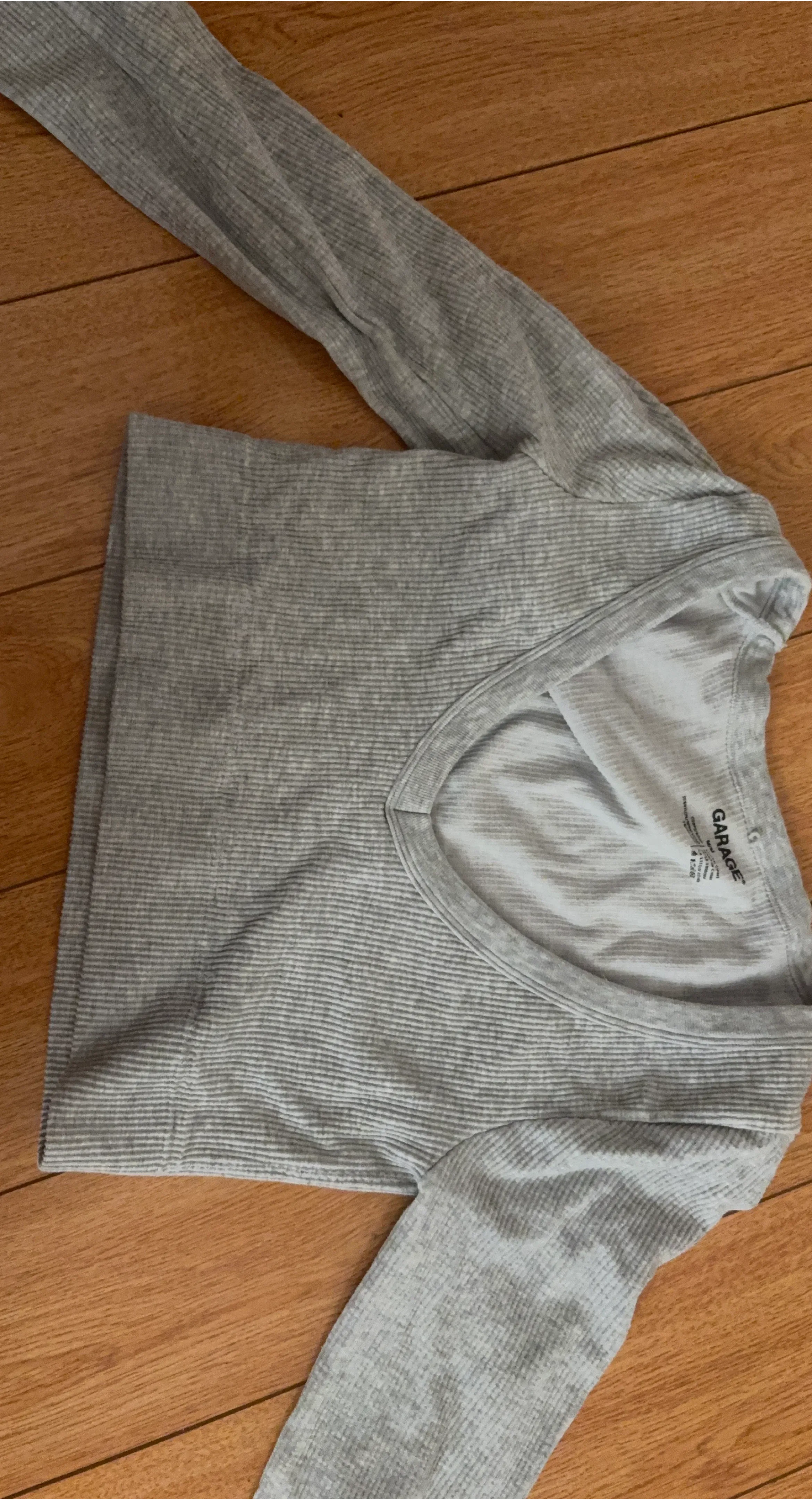 This is a GARAGE grey ribbed long sleeve top. It's a size M and made with a comfortable, stretchy material. Its v-neck design makes it a versatile piece for layering or wearing on its own.