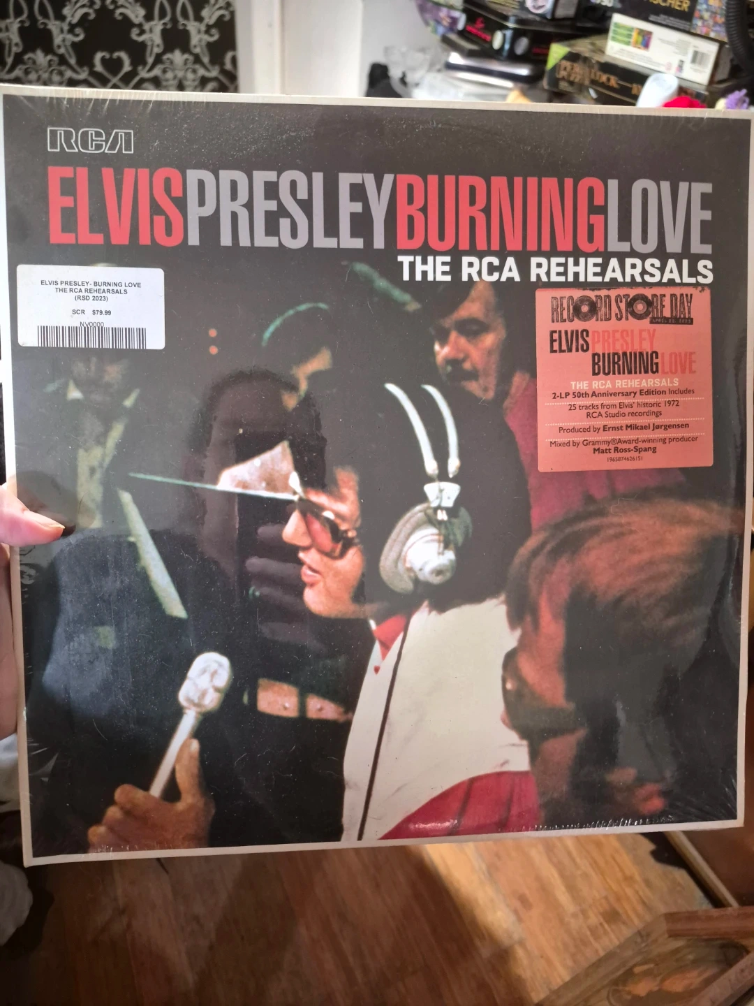This is the Elvis Presley "Burning Love: The RCA Rehearsals" 2-LP vinyl record. It's a 50th Anniversary Edition featuring 25 tracks from historic 1972 sessions. Mixed by Grand Master mixing producer Matt Ross-Spang.