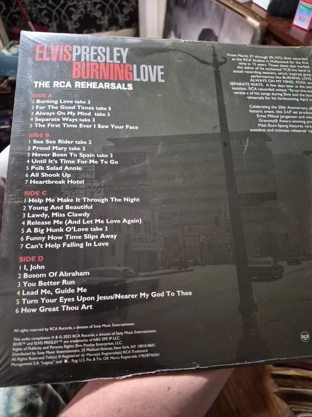 This is the Elvis Presley "Burning Love: The RCA Rehearsals" 2-LP vinyl record. It's a 50th Anniversary Edition featuring 25 tracks from historic 1972 sessions. Mixed by Grand Master mixing producer Matt Ross-Spang.