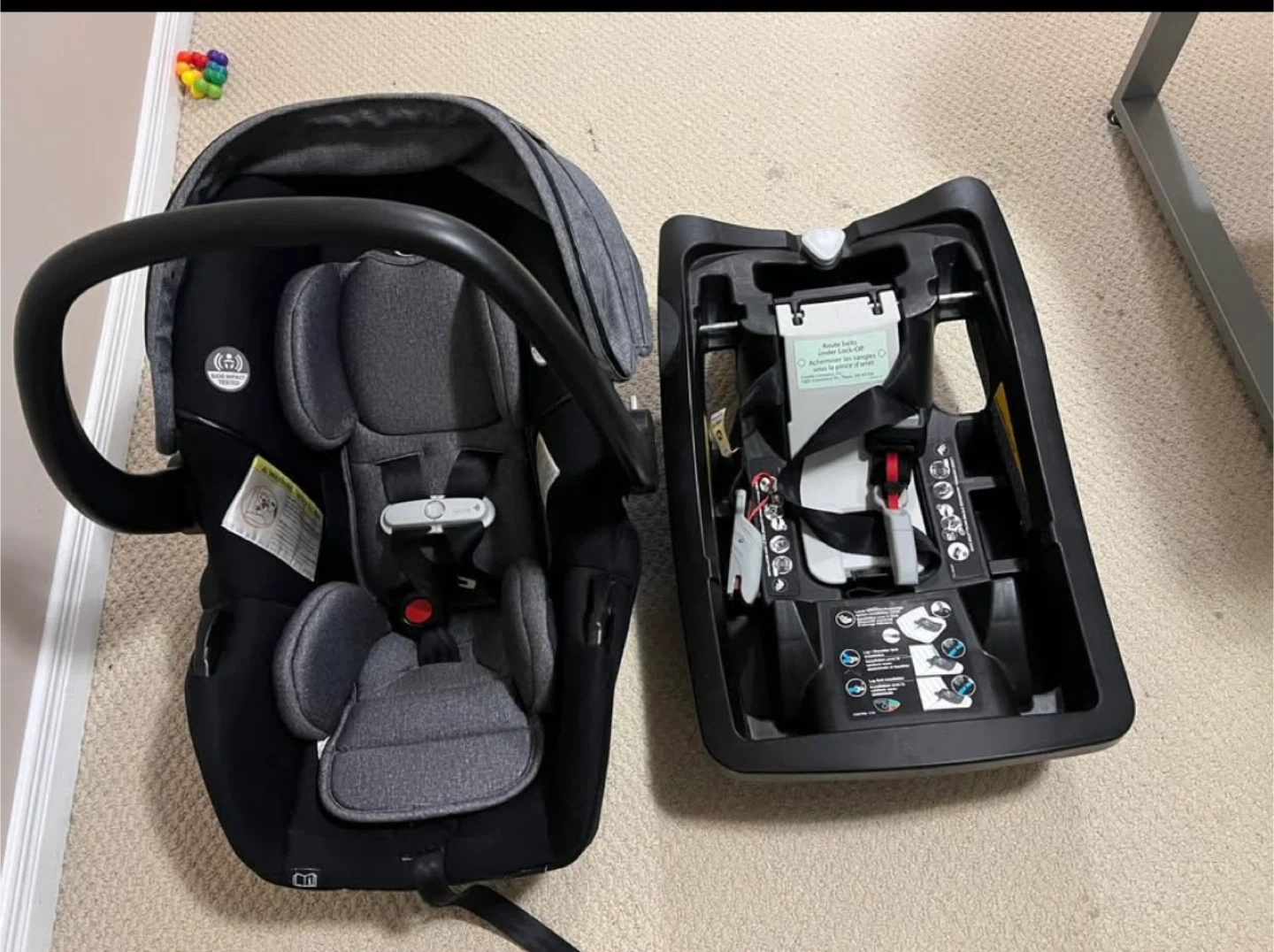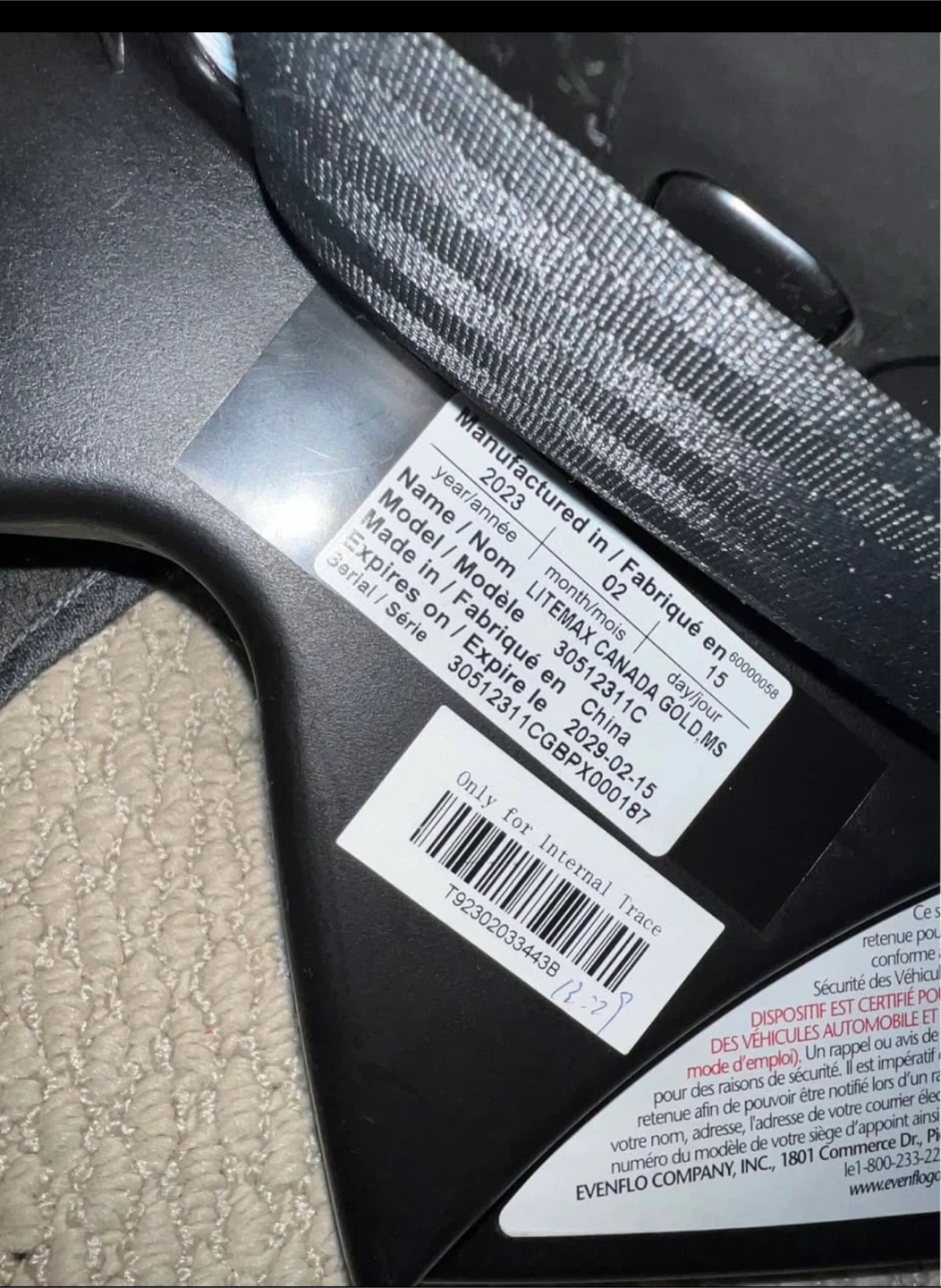 Selling an Evenflo LiteMax Canada Gold infant car seat. The manufacturing date is 2023 February 15 and the expiry date is 2029 February 15