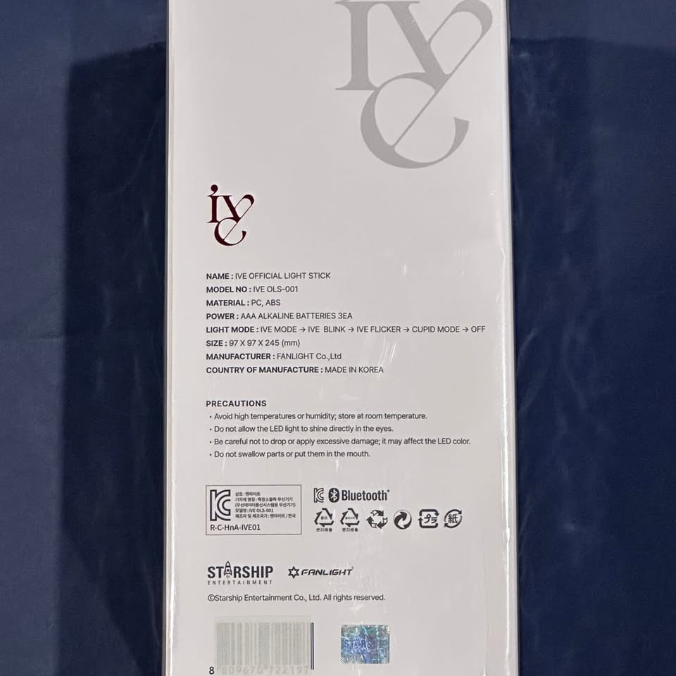 Get your official IVE Light Stick Ver. 1 for all your fan events and concerts. This light stick is brand new and sealed in its original packaging, perfect for any DIVE. It features multiple light modes: IVE MODE, IVE BLINK, and CUPID MODE. The design is sleek and features the IVE logo. This authentic fan merchandise was manufactured in Korea by FANLIGHT Co. Ltd. and is an essential item for showing your support.