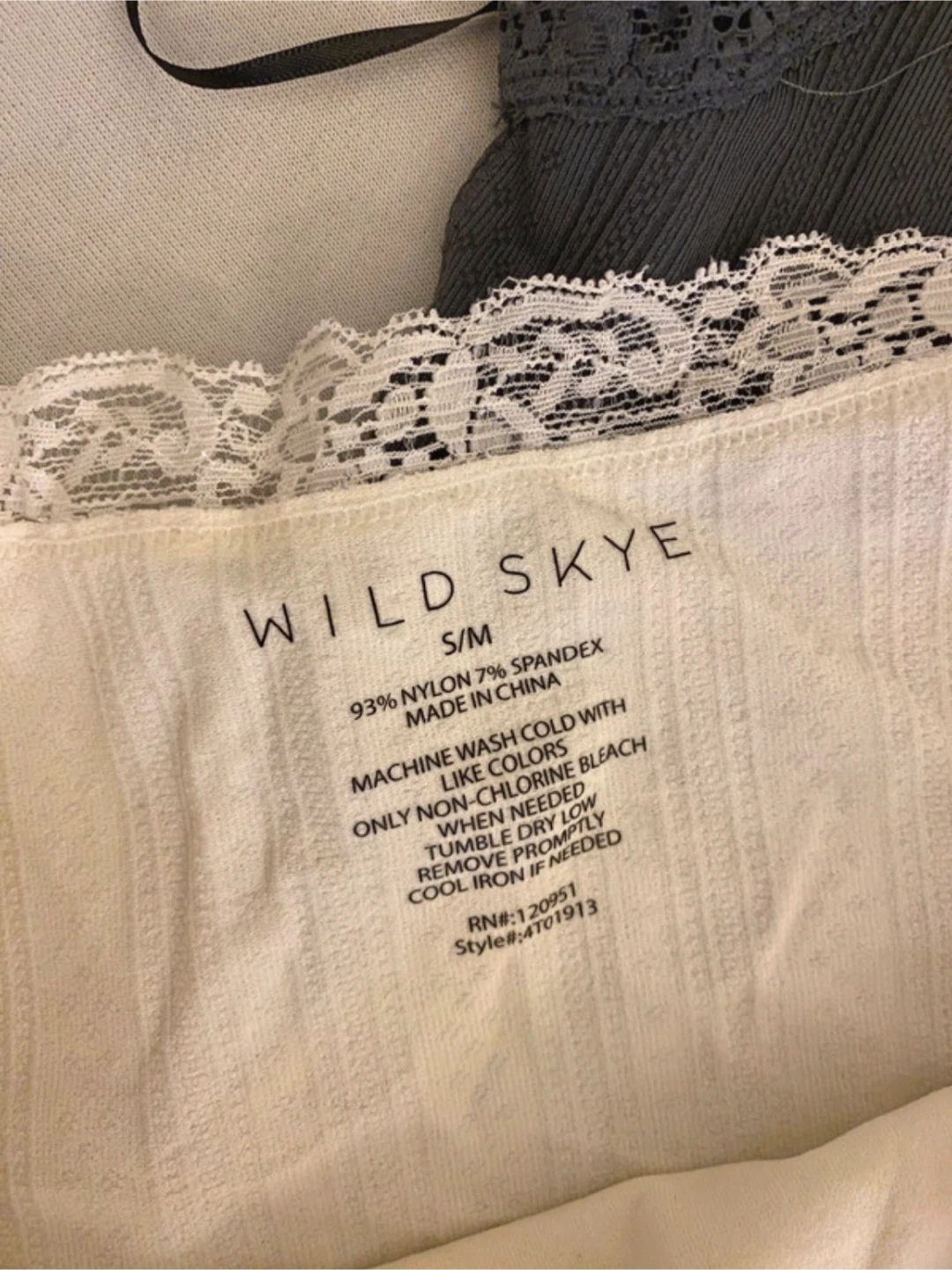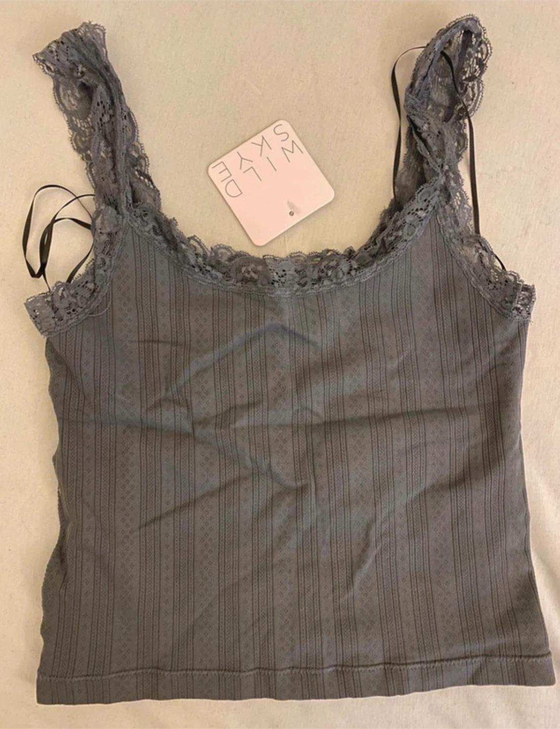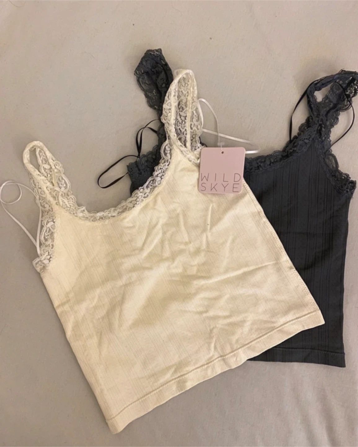 Two Wild Skye set camisole tops with delicate lace trim. One is a deep grey, and the other is cream.