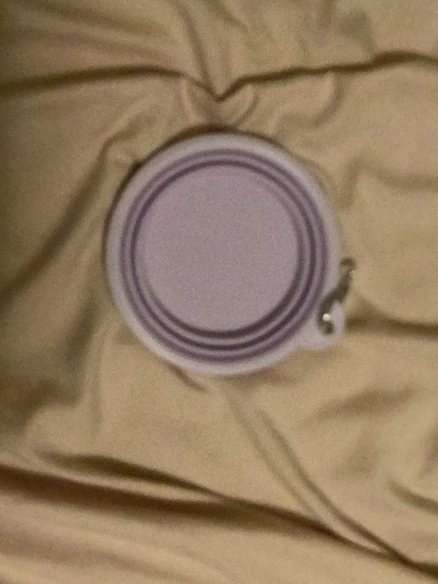 This is a brand new, portable dog bowl, perfect for walks or travel. It is purple and collapsible, making it easy to store when not in use.