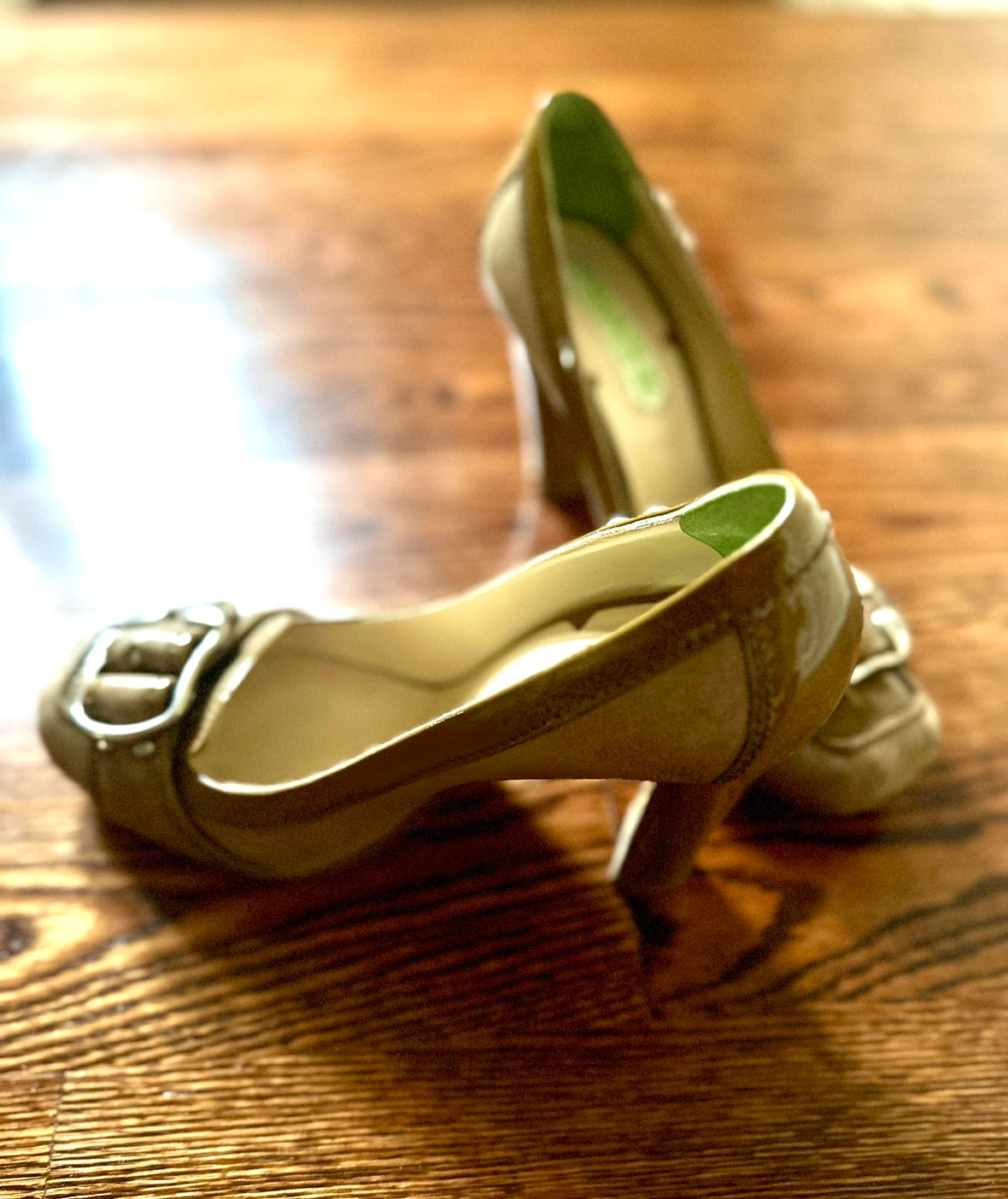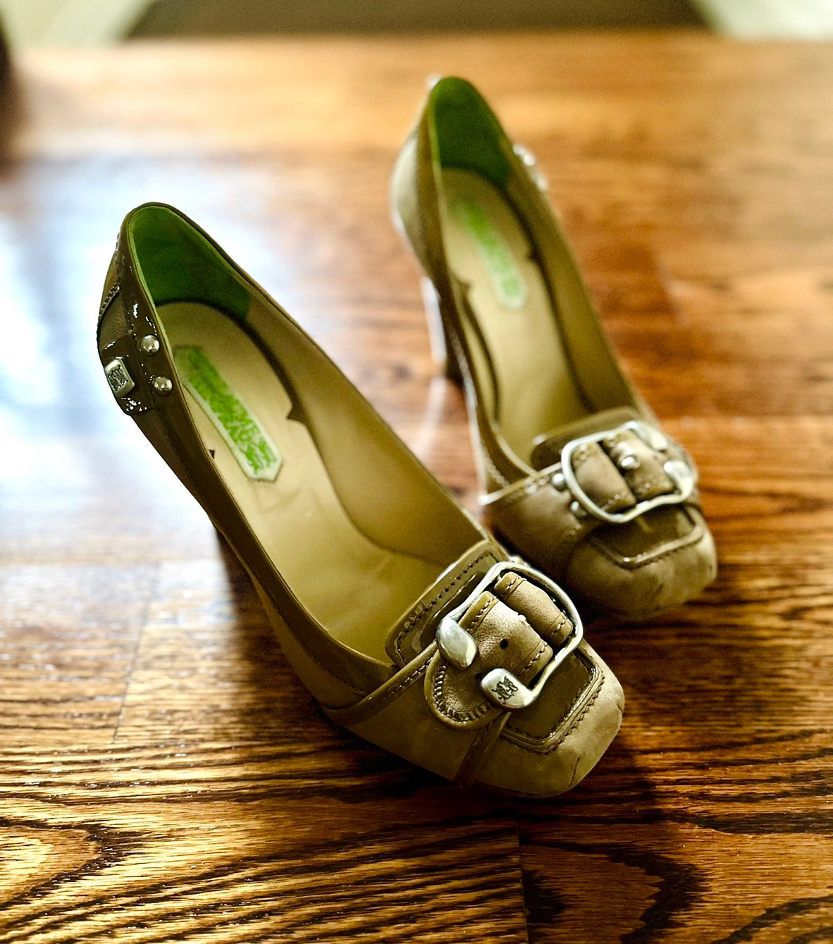 Stylish chunky heels Italian-made shoes. Olive green patent leather with soft leather sides. Buckle and side decoration with lion motif.