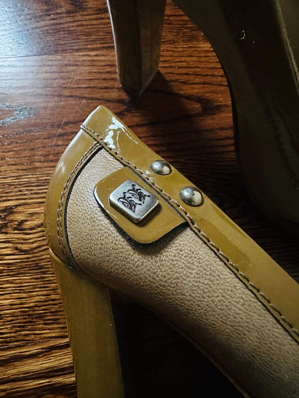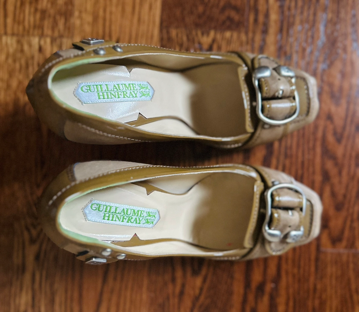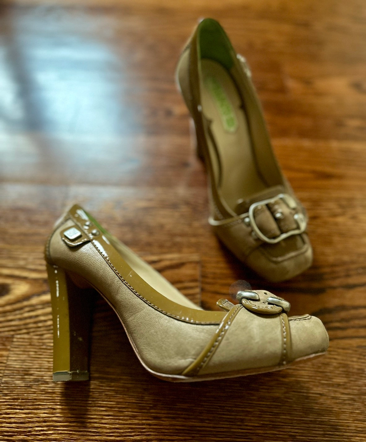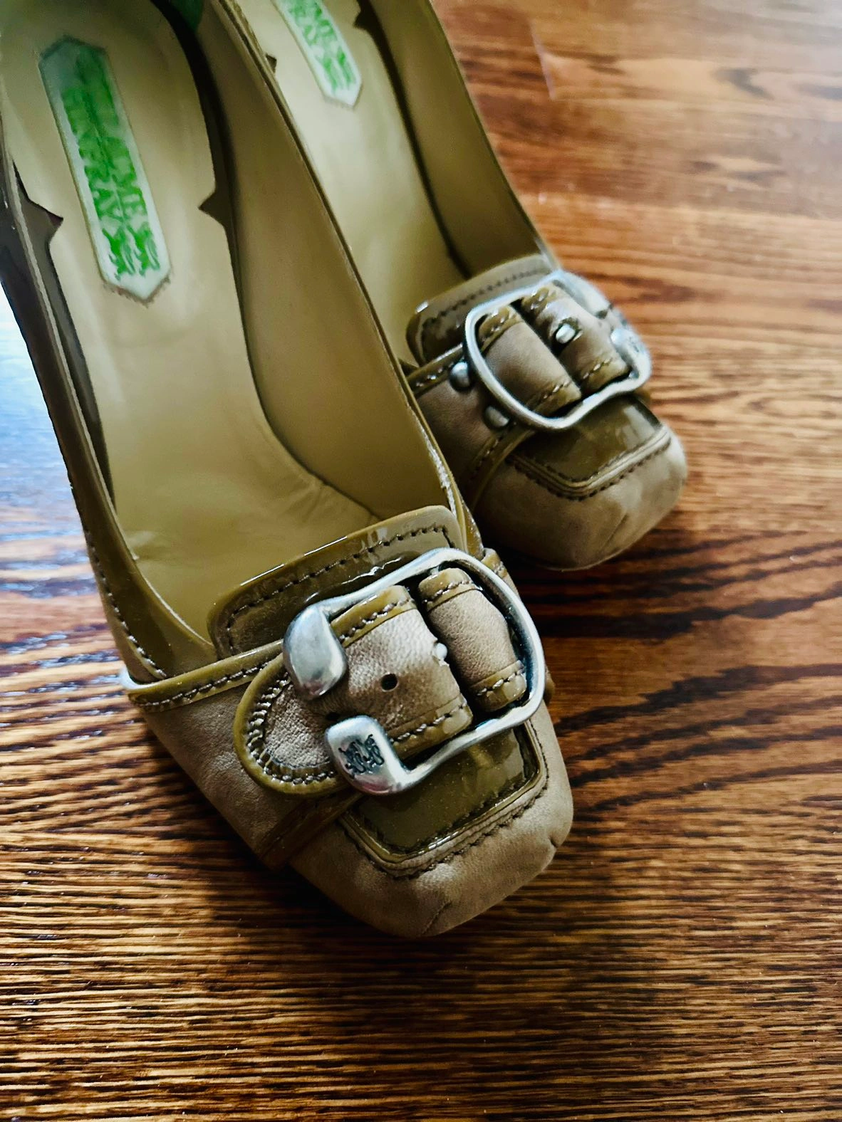 Stylish chunky heels Italian-made shoes. Olive green patent leather with soft leather sides. Buckle and side decoration with lion motif.