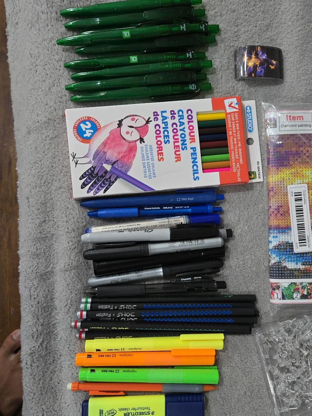 This lot includes a collection of writing and drawing tools. It features 24 coloured pencils, several assorted pens, and a set of highlighters, permanent markers, board pins, diamond painting art, stickers and more. These items are great for general use and creative projects.