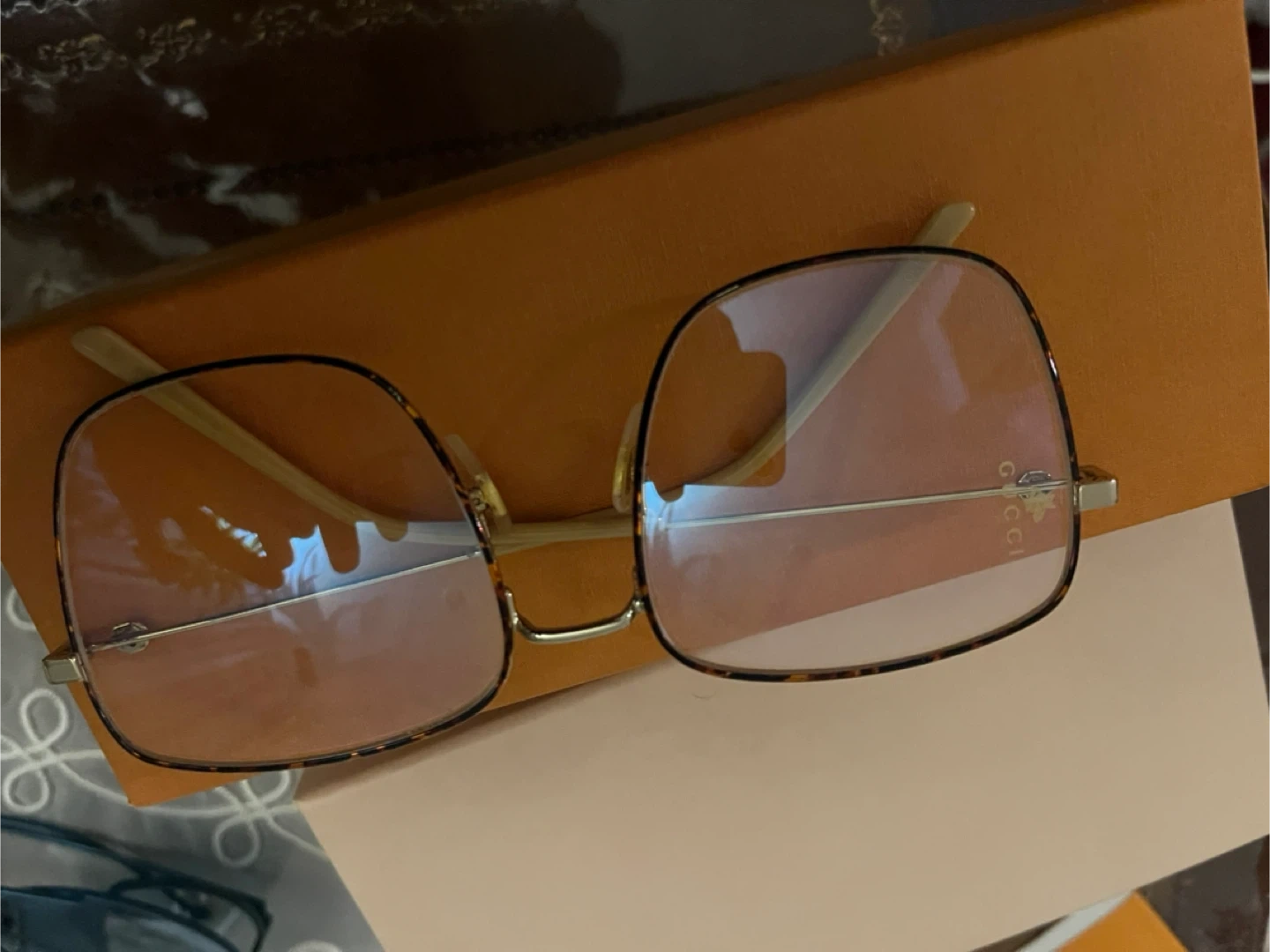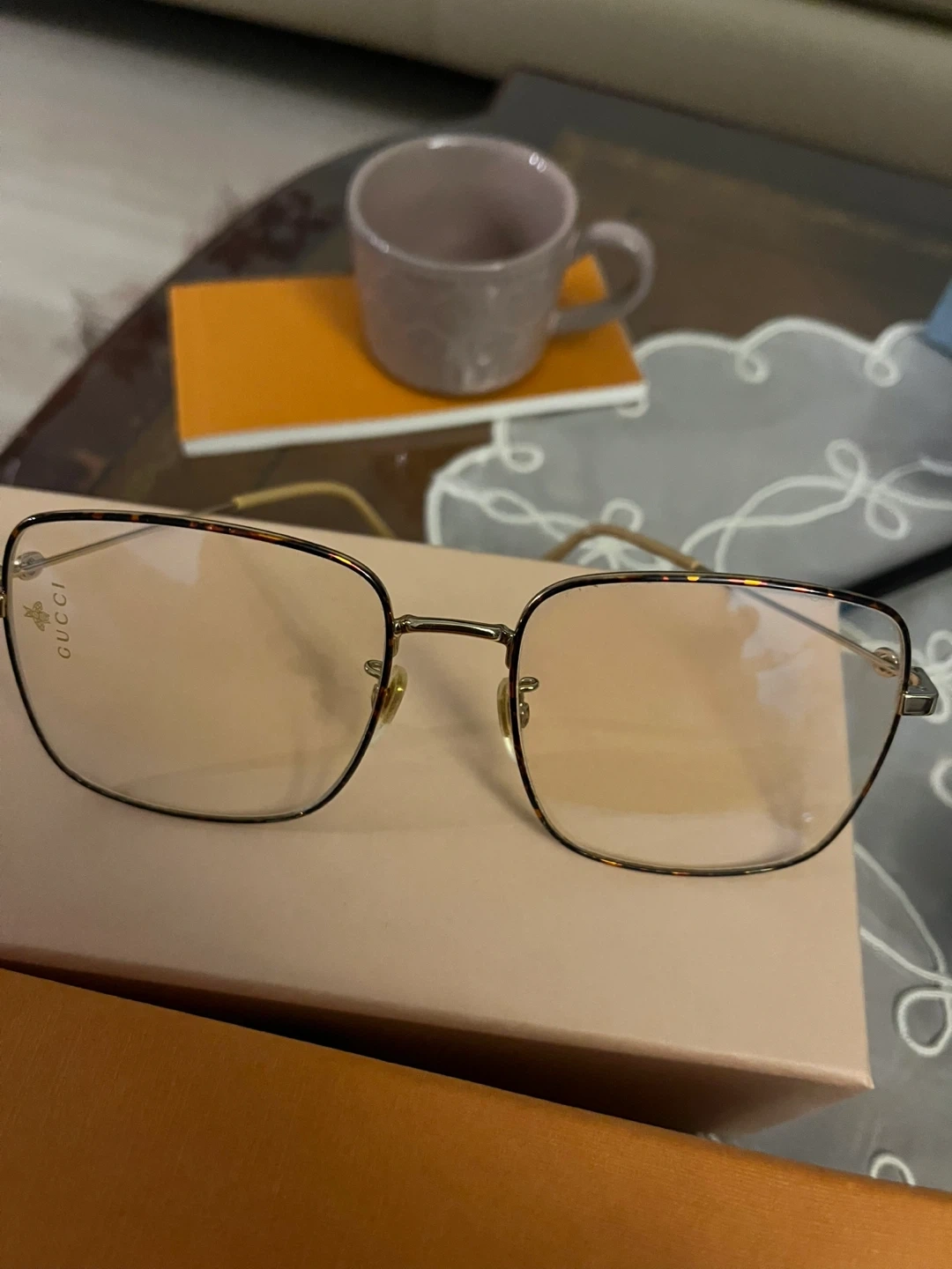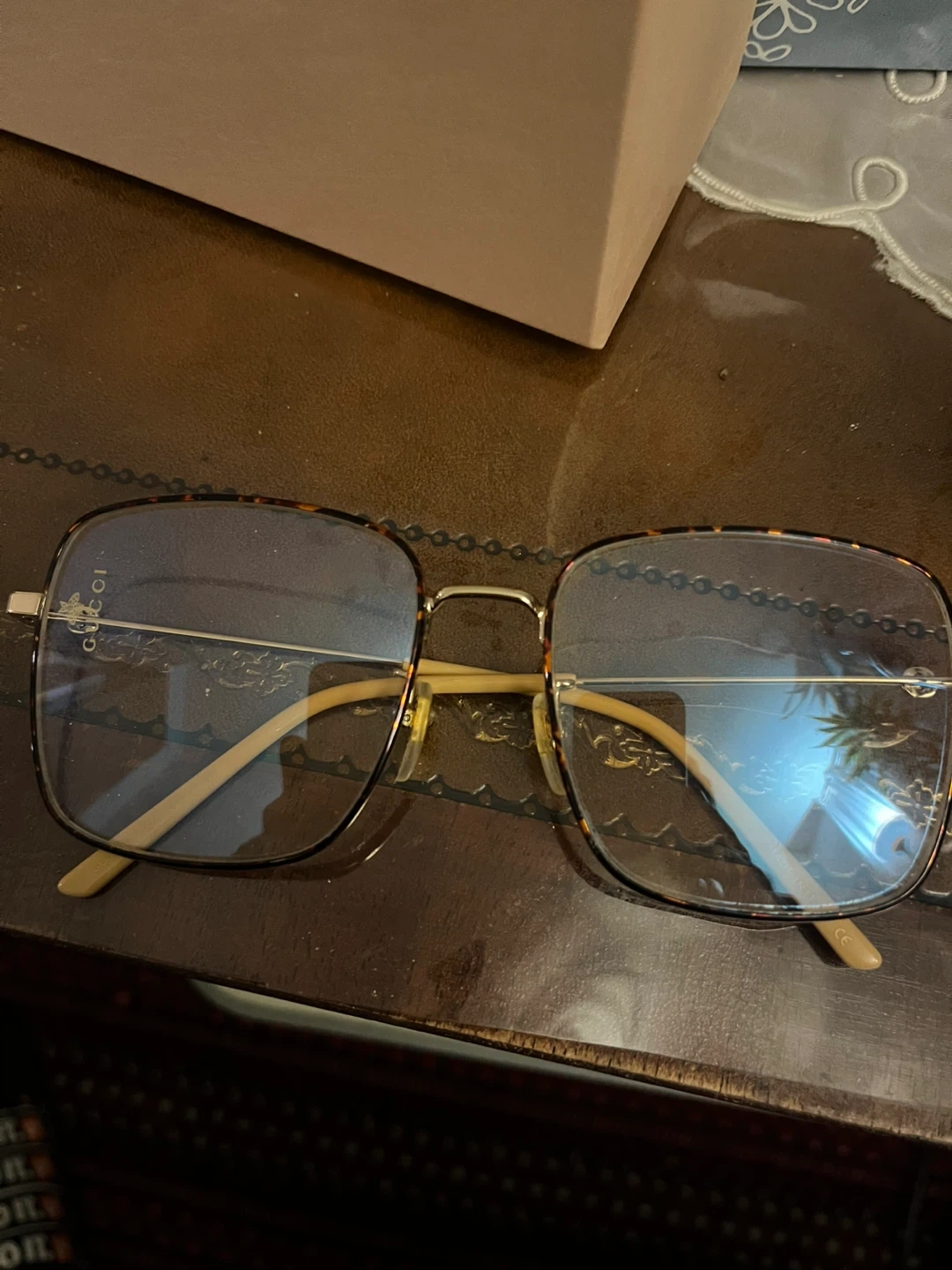 Authentic Gucci glasses with a tortoise shell frame. These square-shaped frames feature gold-tone metal accents and clear lenses. They're stylish and a great accessory for everyday wear!