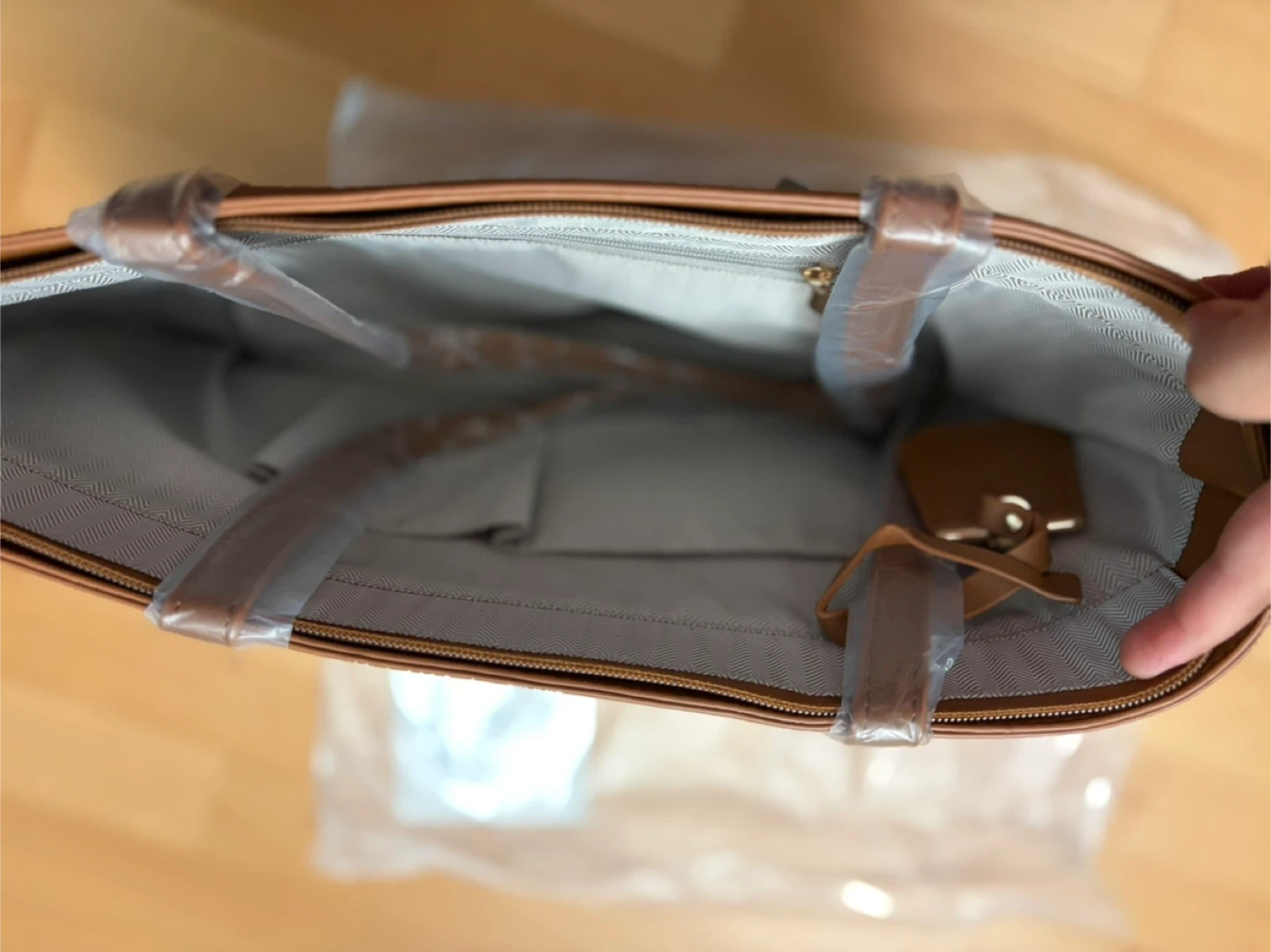 A stylish brown tote bag made from faux leather. It features a zippered closure and a lined interior with pockets. This bag's versatile design makes it suitable for everyday use.