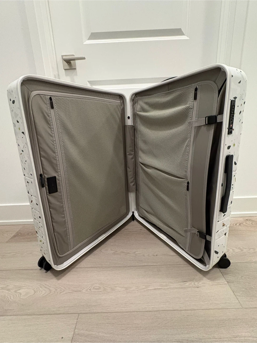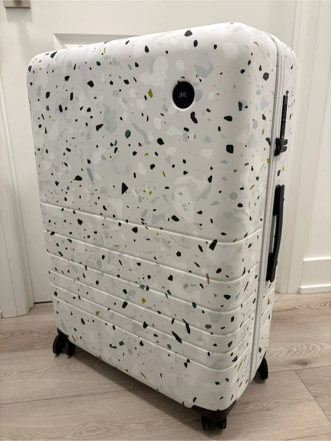 Monos carry-on suitcase in a terrazzo print. It's made from a durable polycarbonate shell. This luggage comes with TSA-approved locks and a lifetime warranty.
