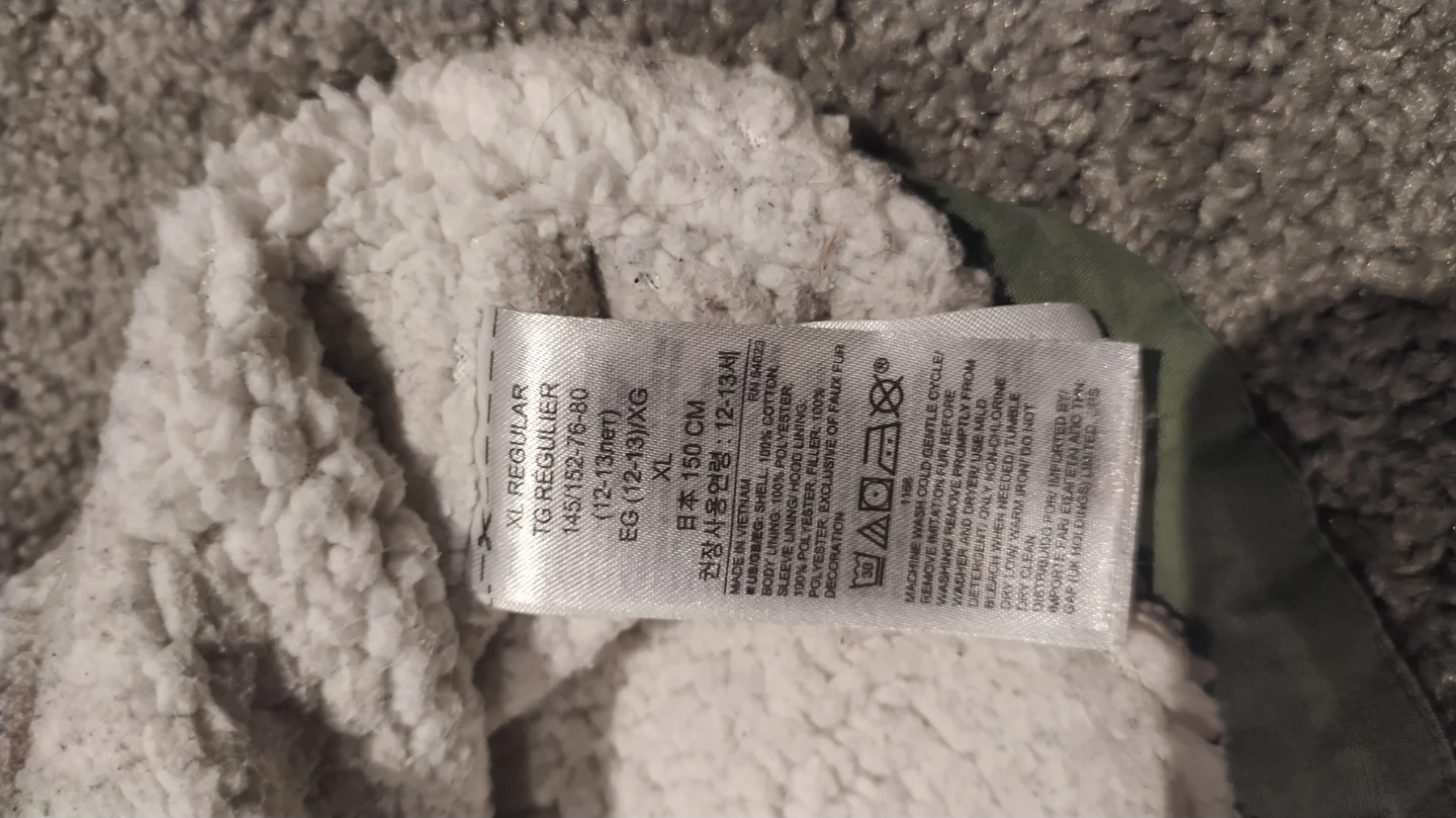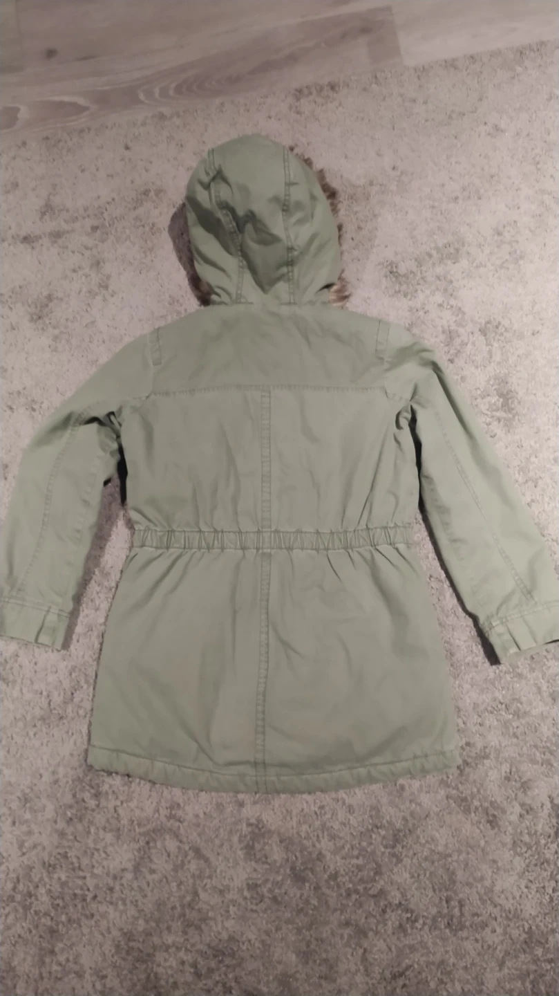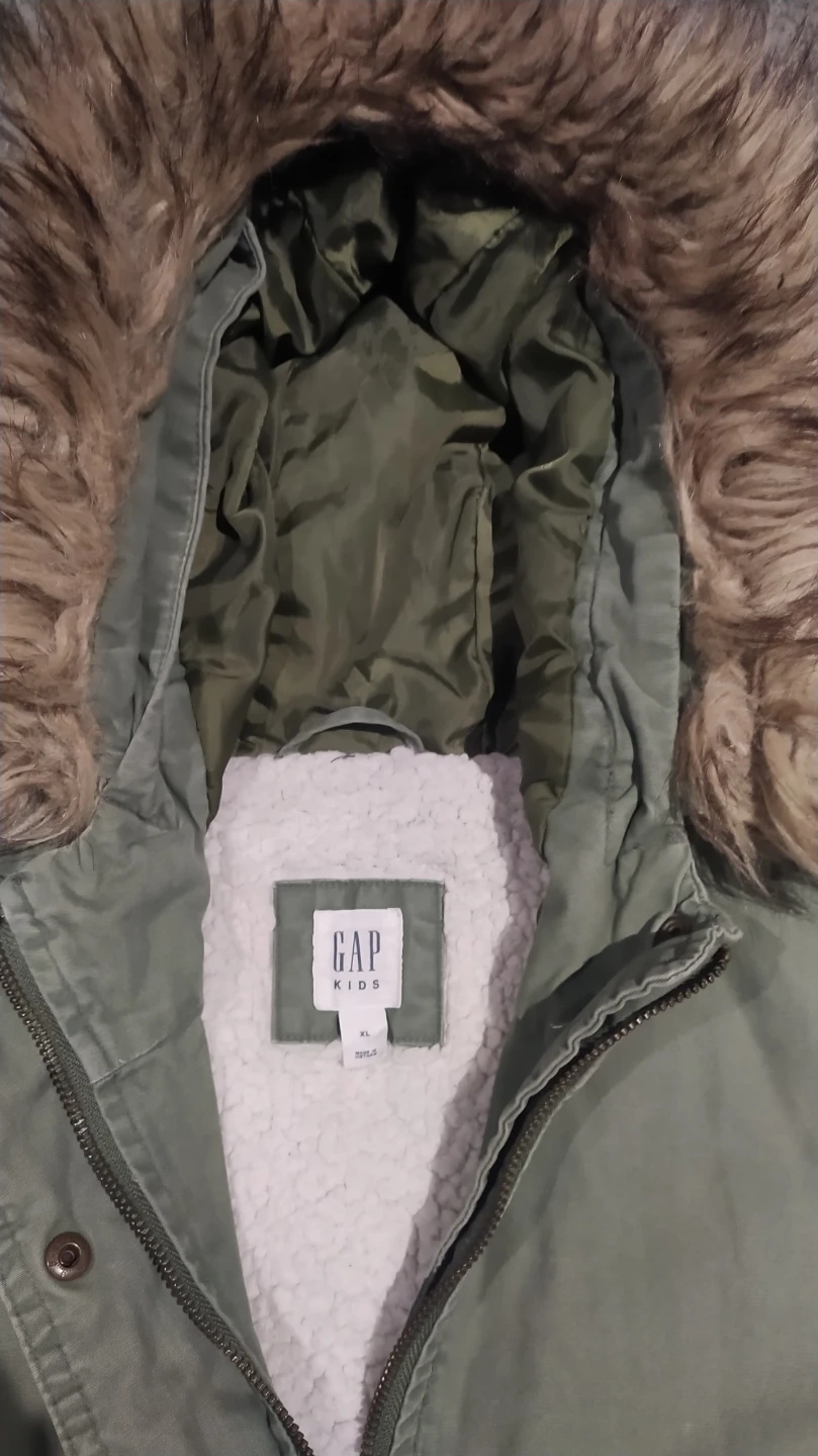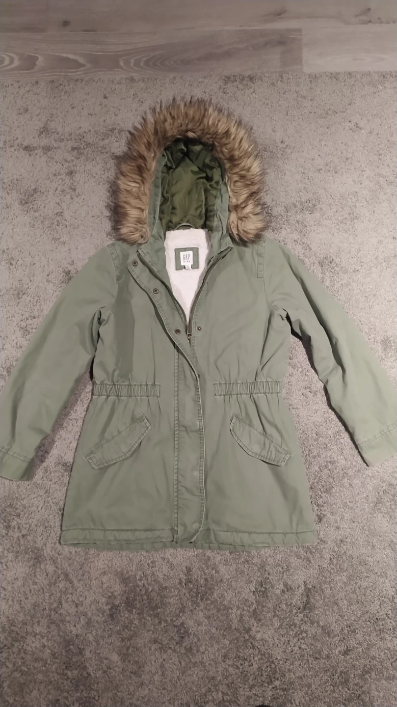 This is a Gap Kids green parka jacket with a cozy faux fur lined hood. It's a size XL (12-13 years). The body lining is 100% polyester sherpa, and the outer is 100% cotton.