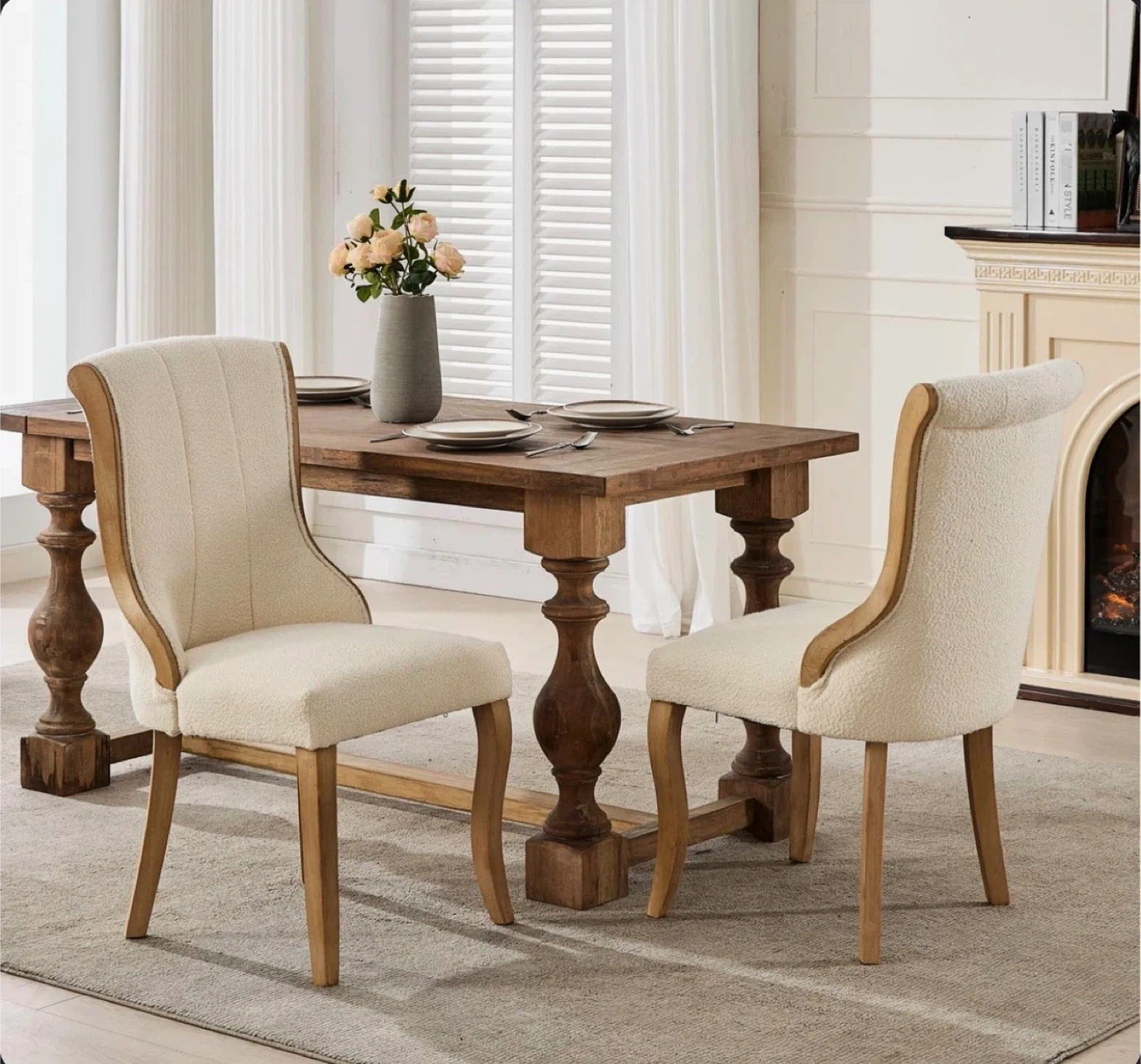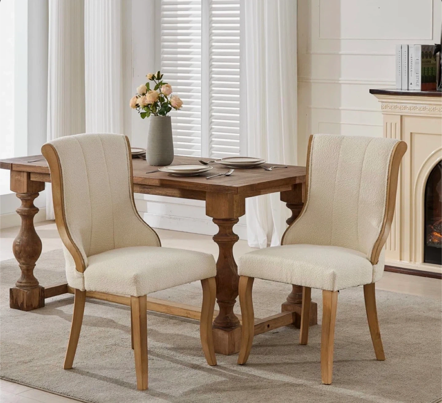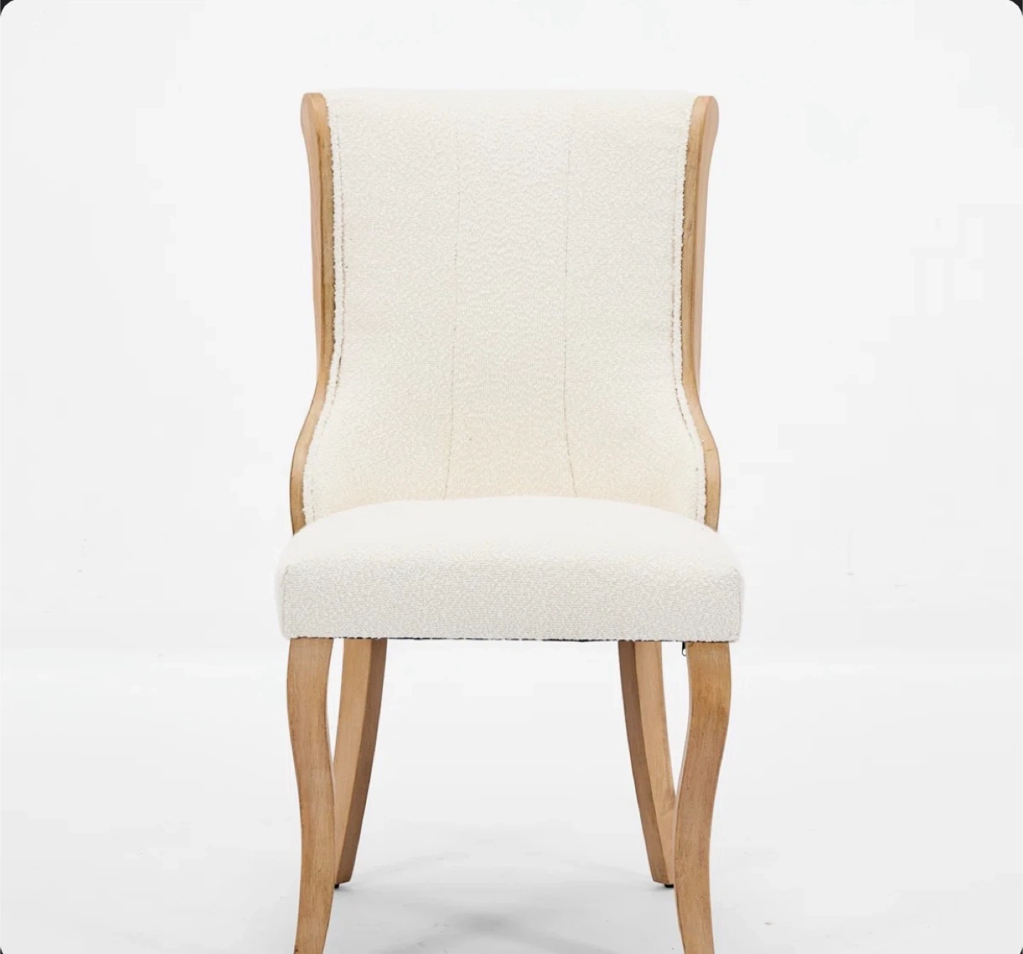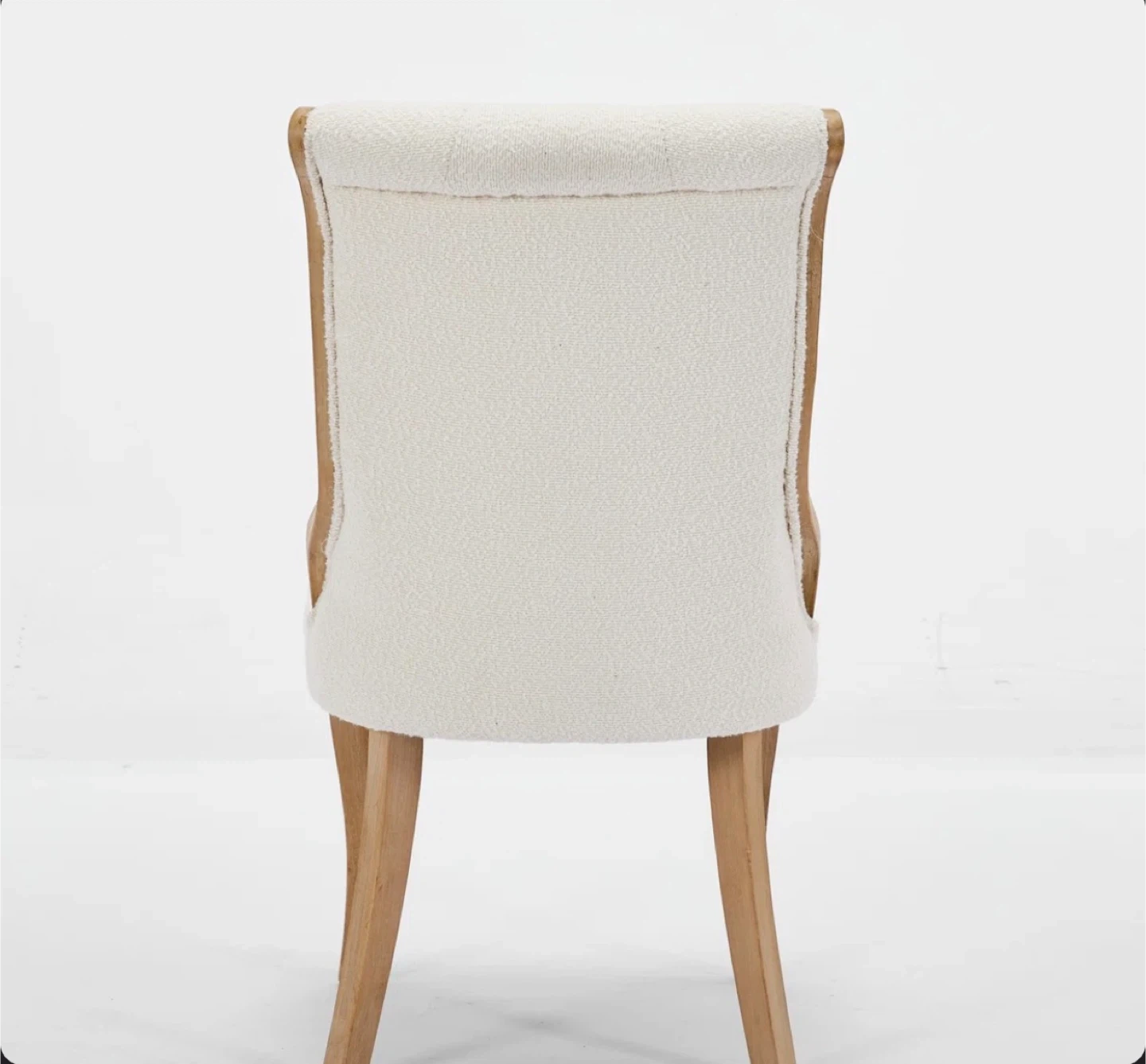Comfy dining chairs featuring a soft boucle fabric upholstery. They have sturdy wooden legs and a curved back for support. These chairs are a nice addition to any dining room!