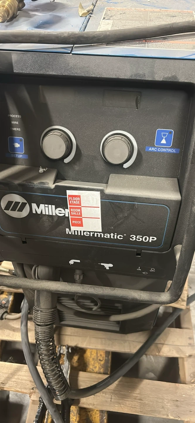 Miller Millermatic 350P welder. Input voltage 200/230V, 60Hz. Phase 3. Amperes 60/61.5A, 34/30.5A. Ideal for professional welding applications.