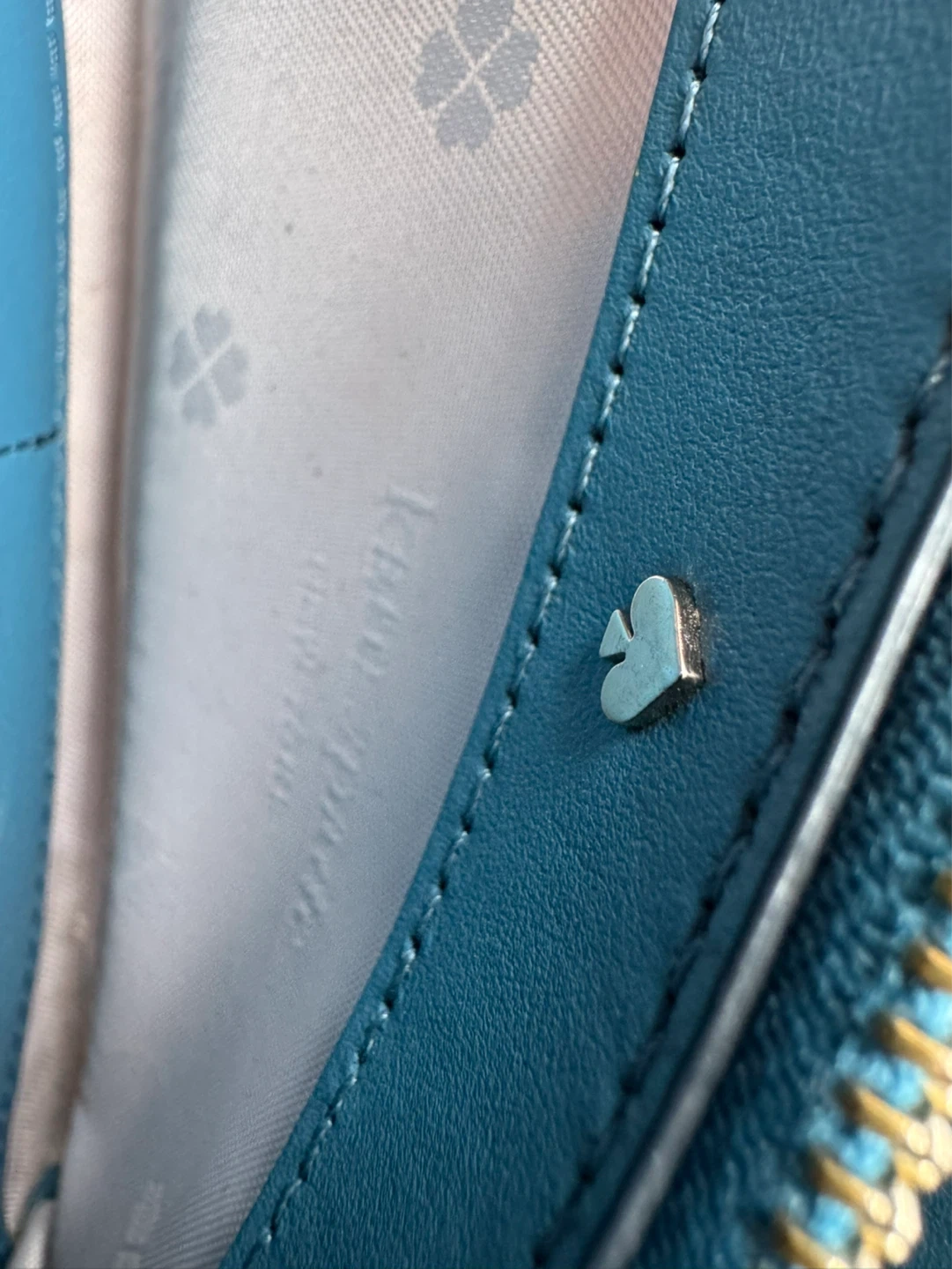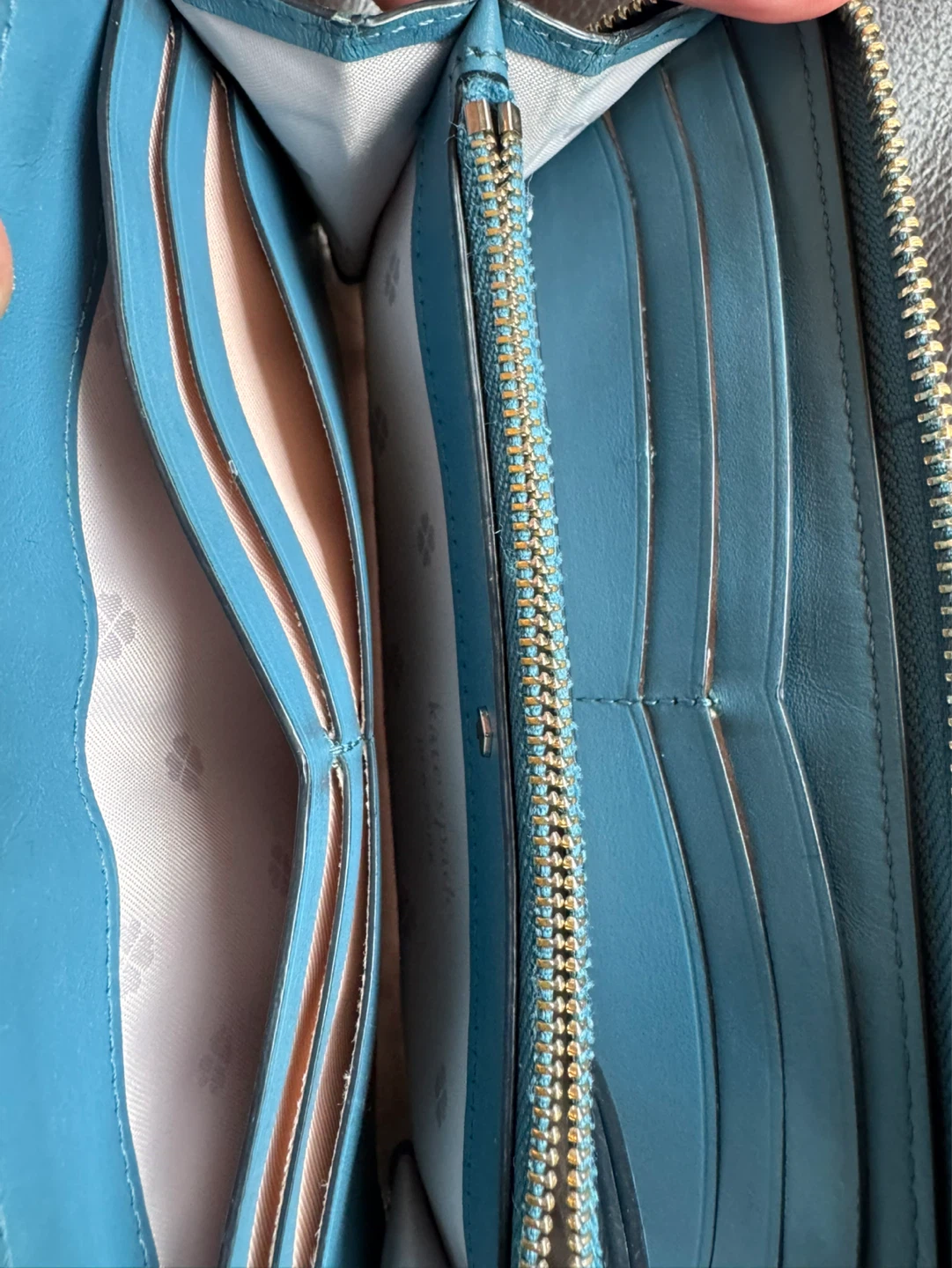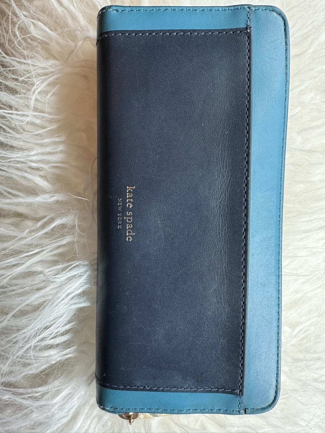 Kate Spade New York zip-around wallet. Leather exterior with multiple card slots and zippered compartment inside. Teal and navy colour blocking.