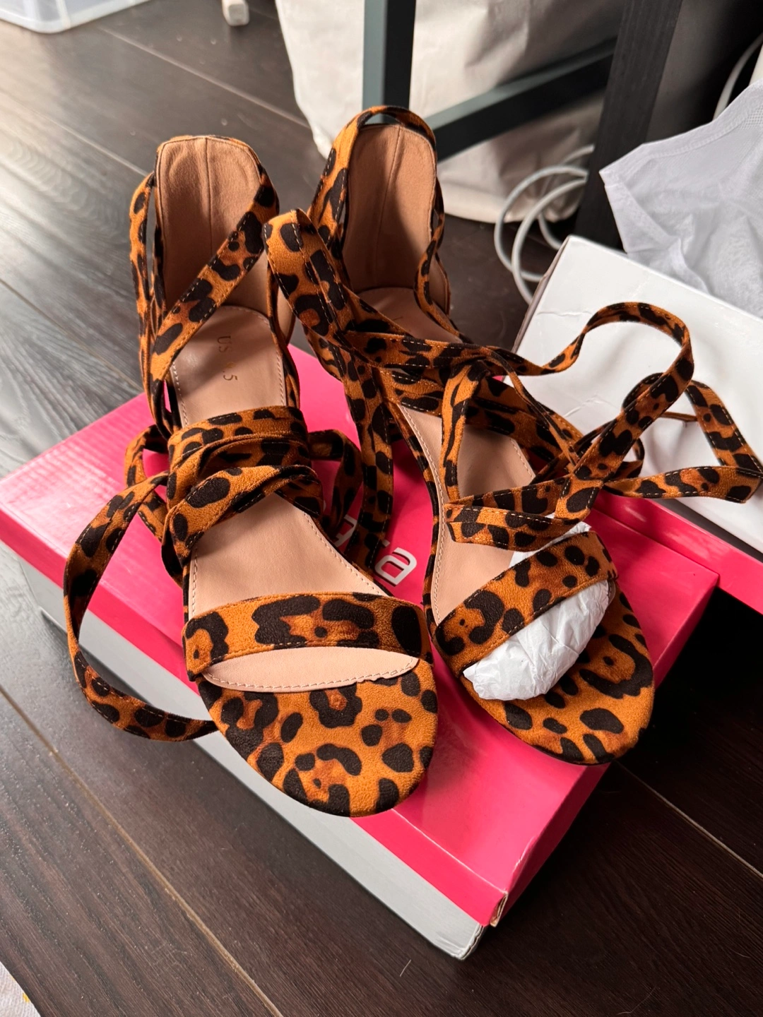 Never worn. Brown and tan leopard print sandals. Lace-up design. Block heel. Size US 9.5.