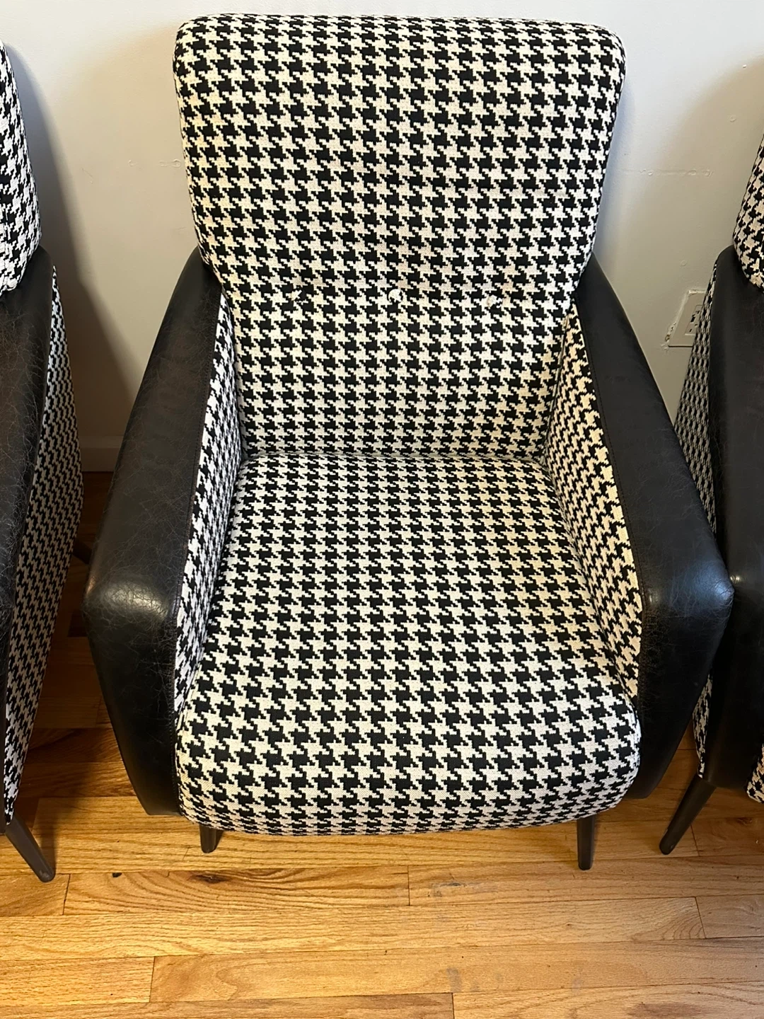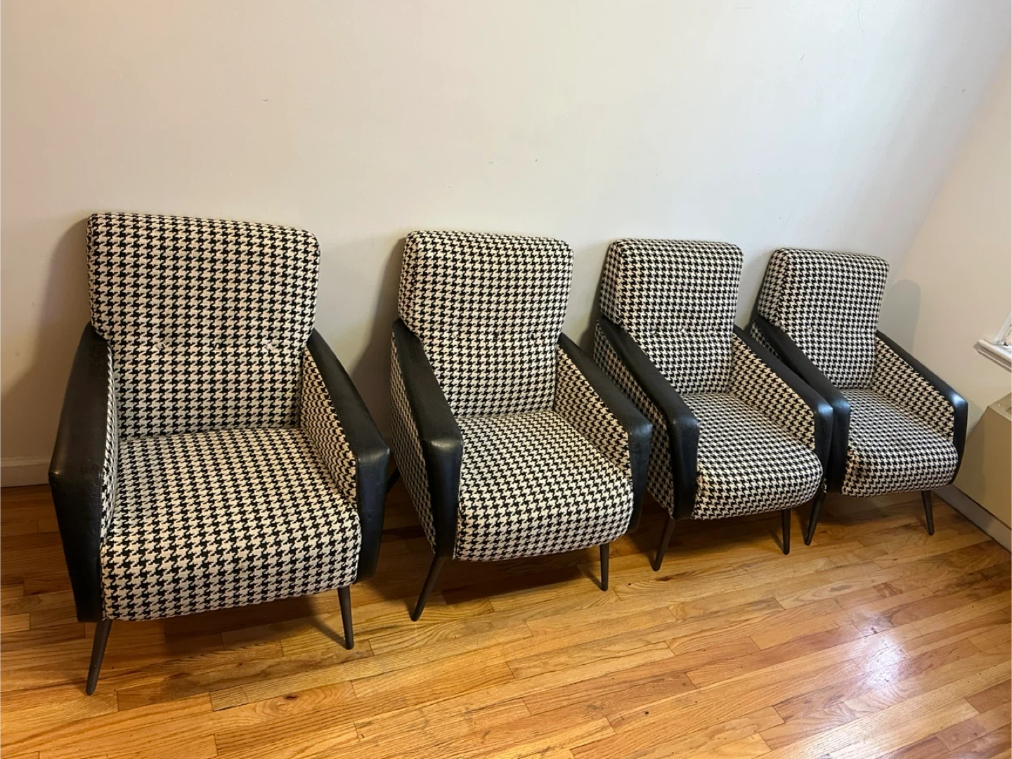 Selling a set of four armchairs featuring a classic houndstooth pattern. The chairs have black armrests and legs, offering a stylish and timeless look for any living space. They are in good condition and ready to add some flair to your home!